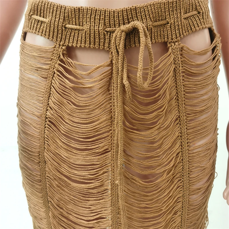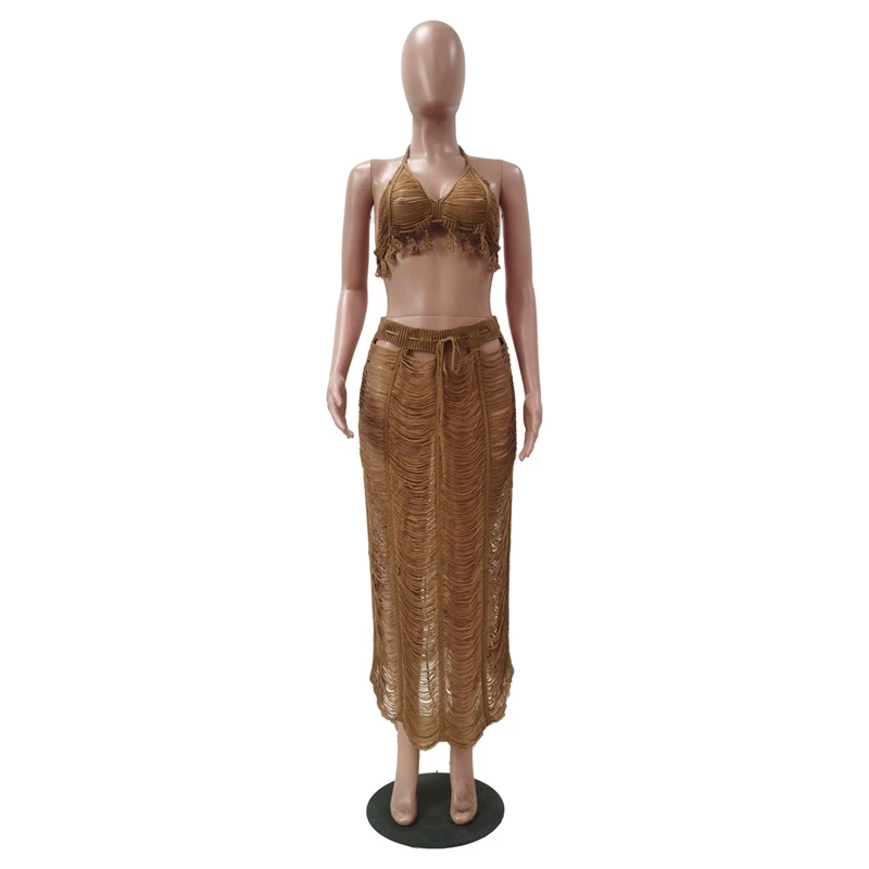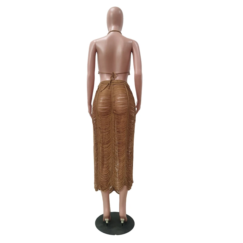 summer 2024 latex women sexy boho blue crochet beach wear halter bra and midi skirt 2 piece set dress outfit clothing clothes