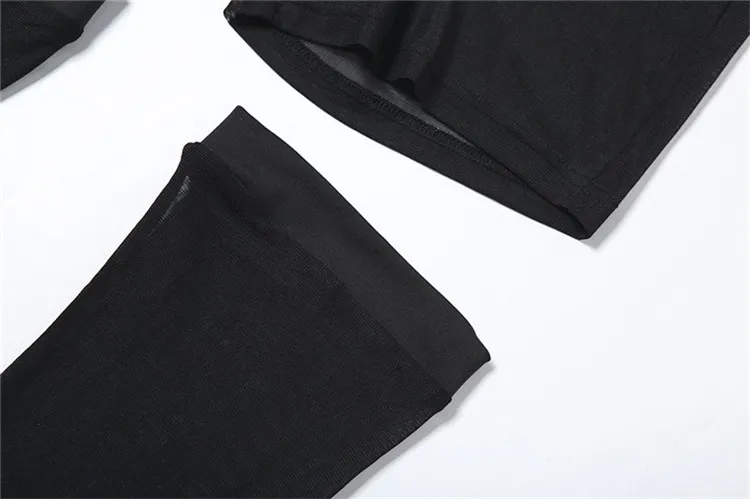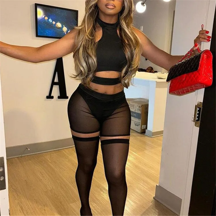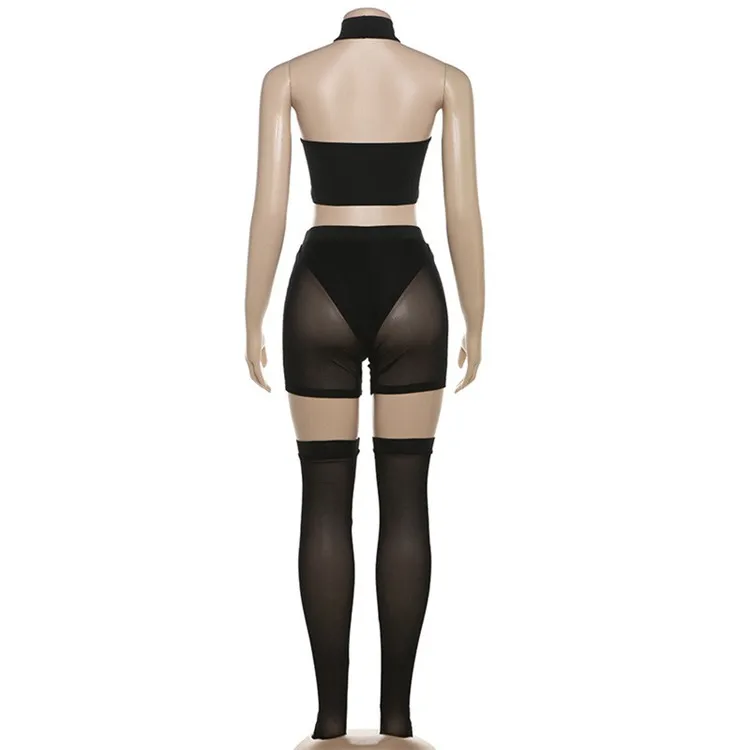 Summer Black Bodycon Three Piece Sets Midnight Club Outfits For Women 2024 Sexy Hollow Out Halter Tank Top Shorts Sets