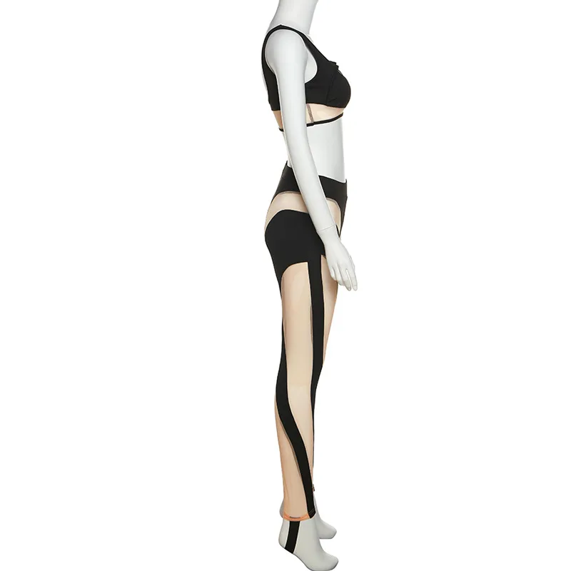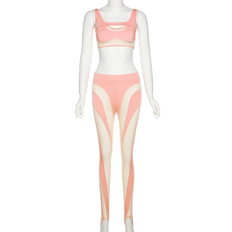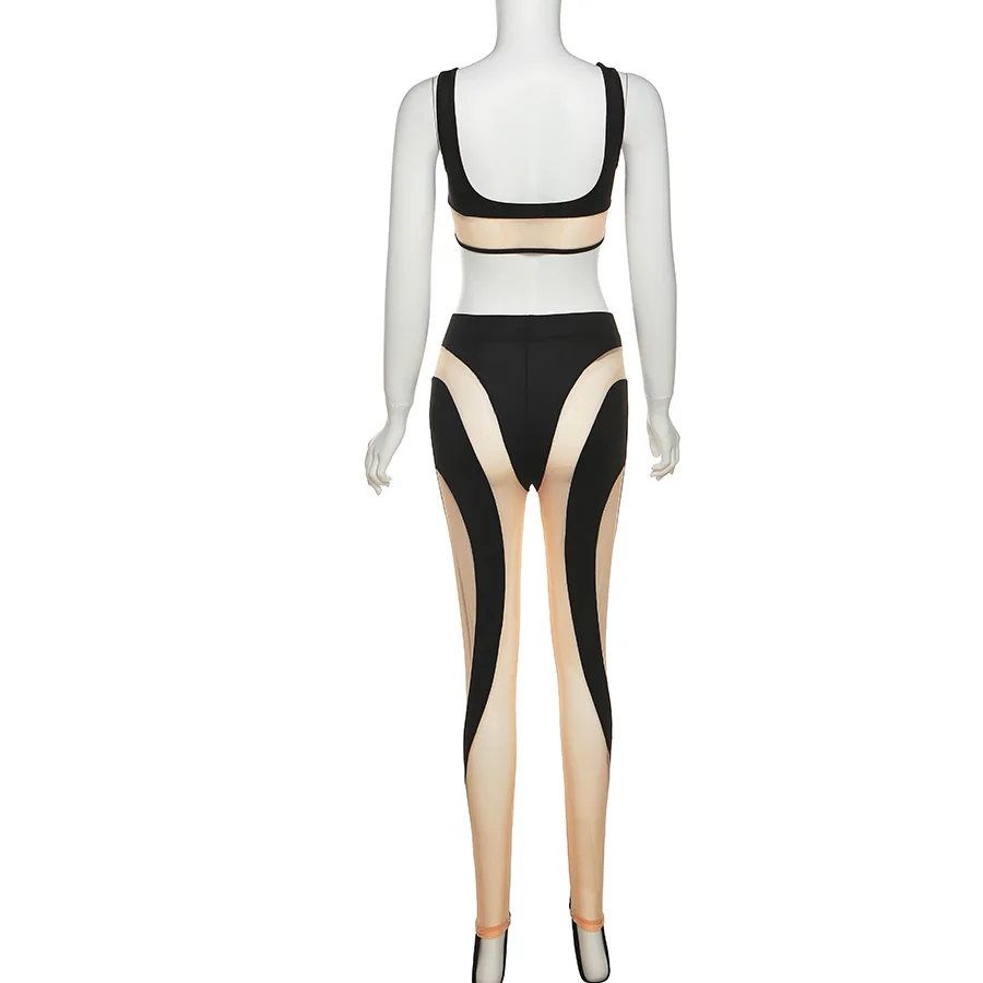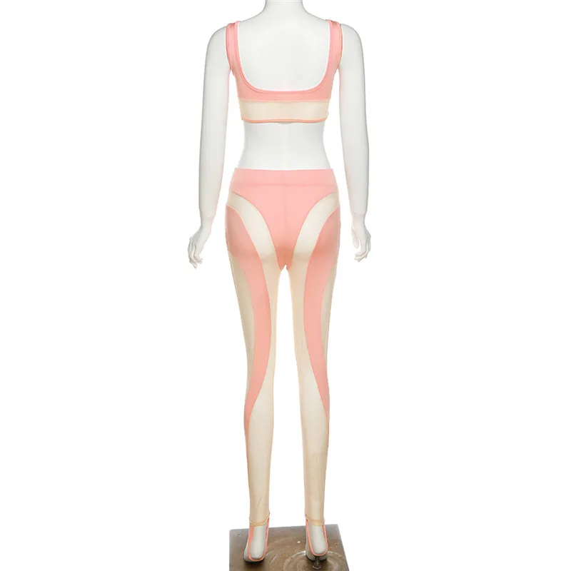 Summer patchwork mesh sheer see through cami crop top and pant sets womens clothing two piece fashion sexy club wear