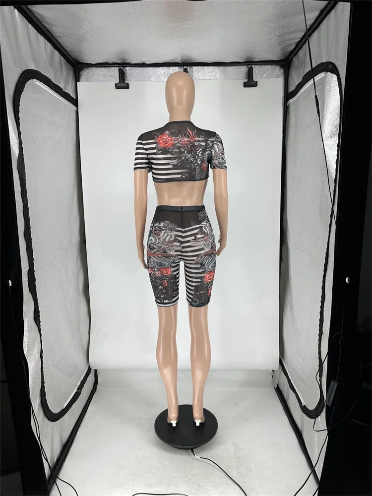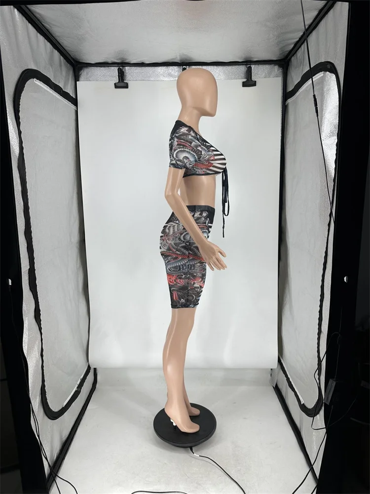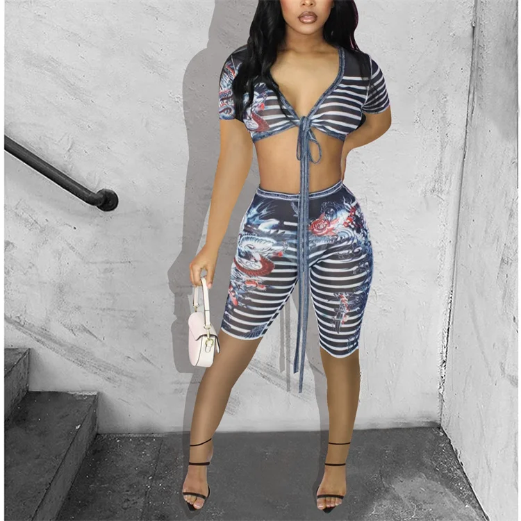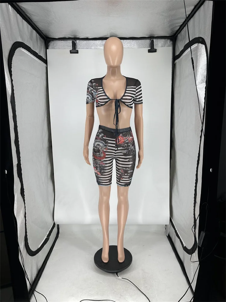 Summer Women Set Dragon Striped Printed Mesh V-neck Top and Shorts Matching Two 2 Piece Outfits