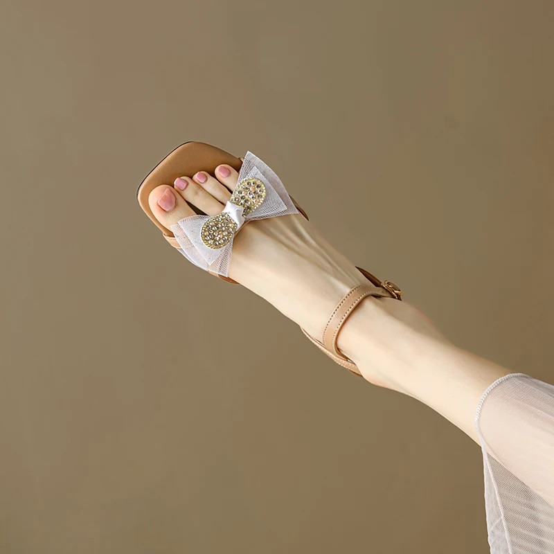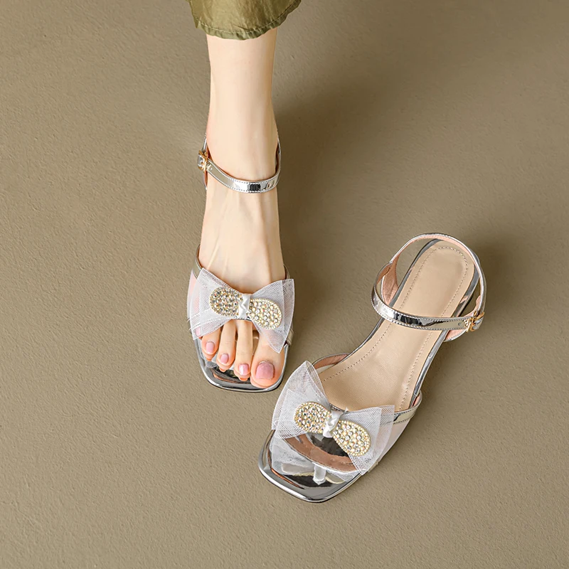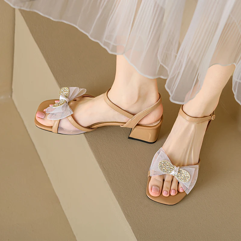 Ubililia Wholesale Sweet Pearl Butterfly High Heel Sandals Women Shoes Korean Style mesh Knot Thick Heel One Buckle Sandals