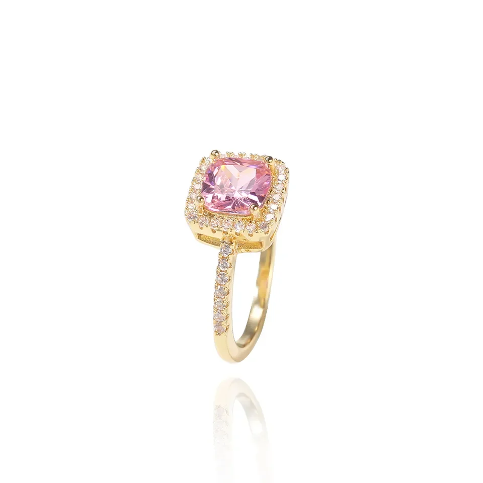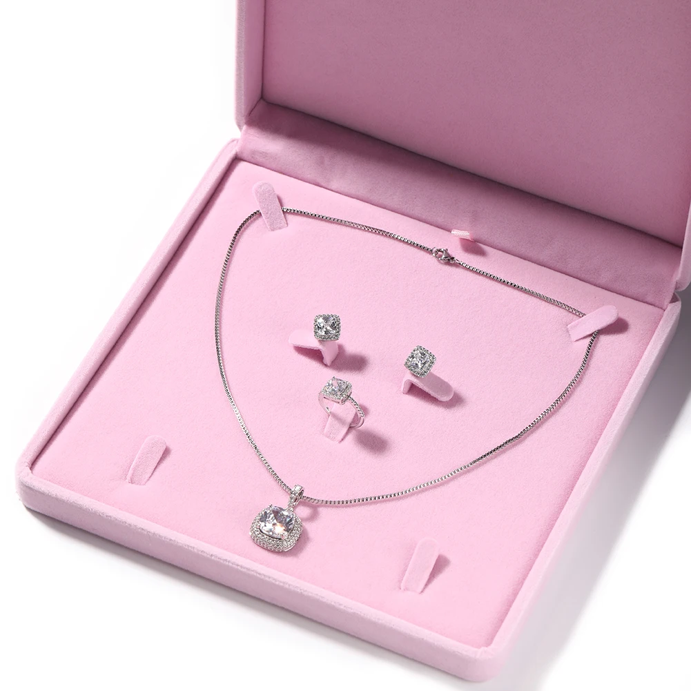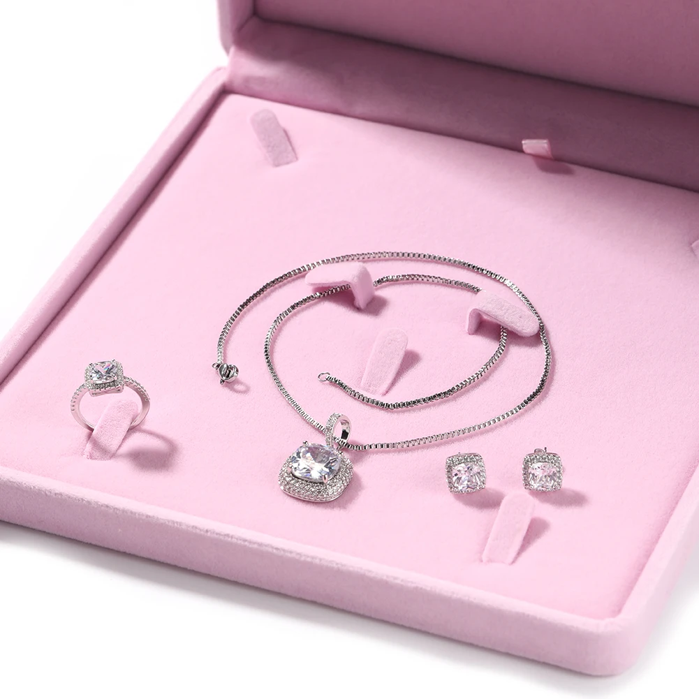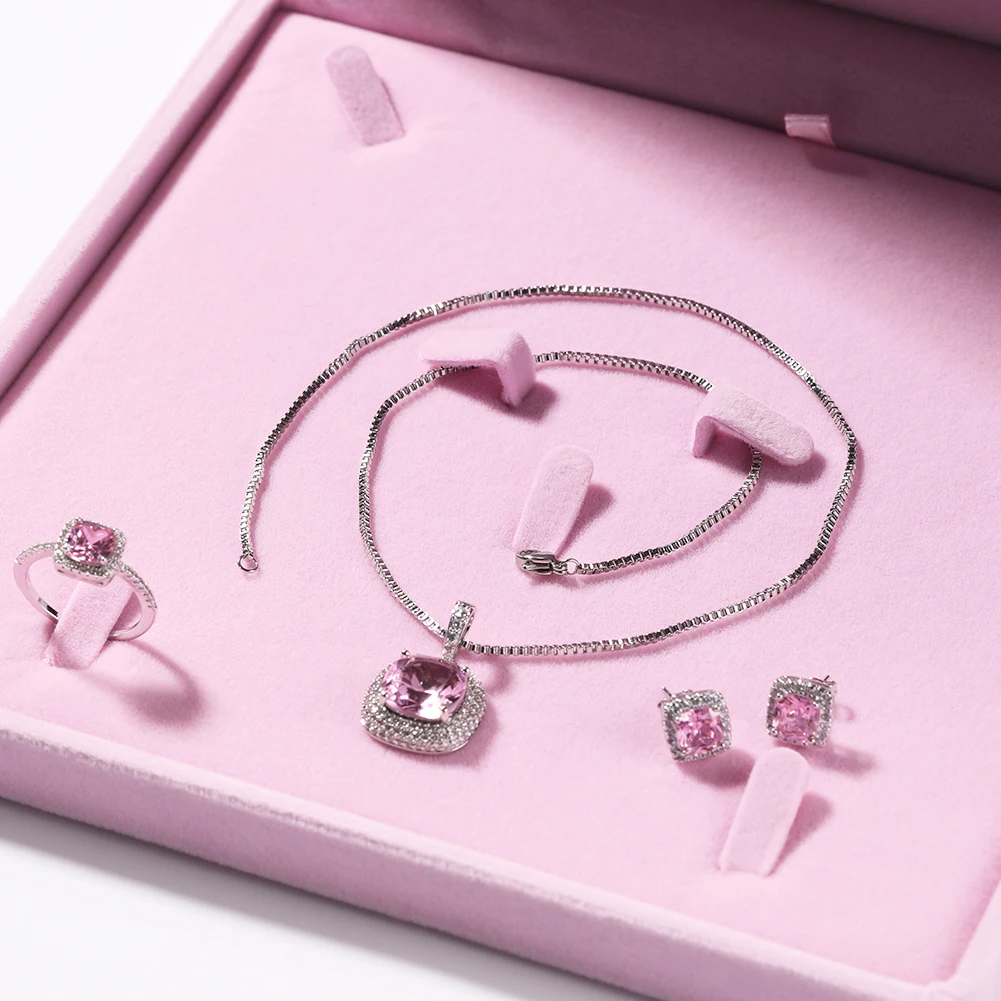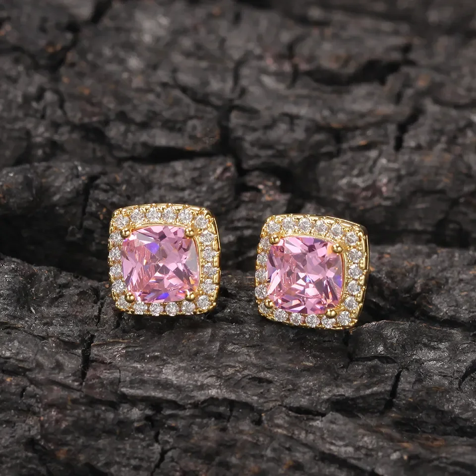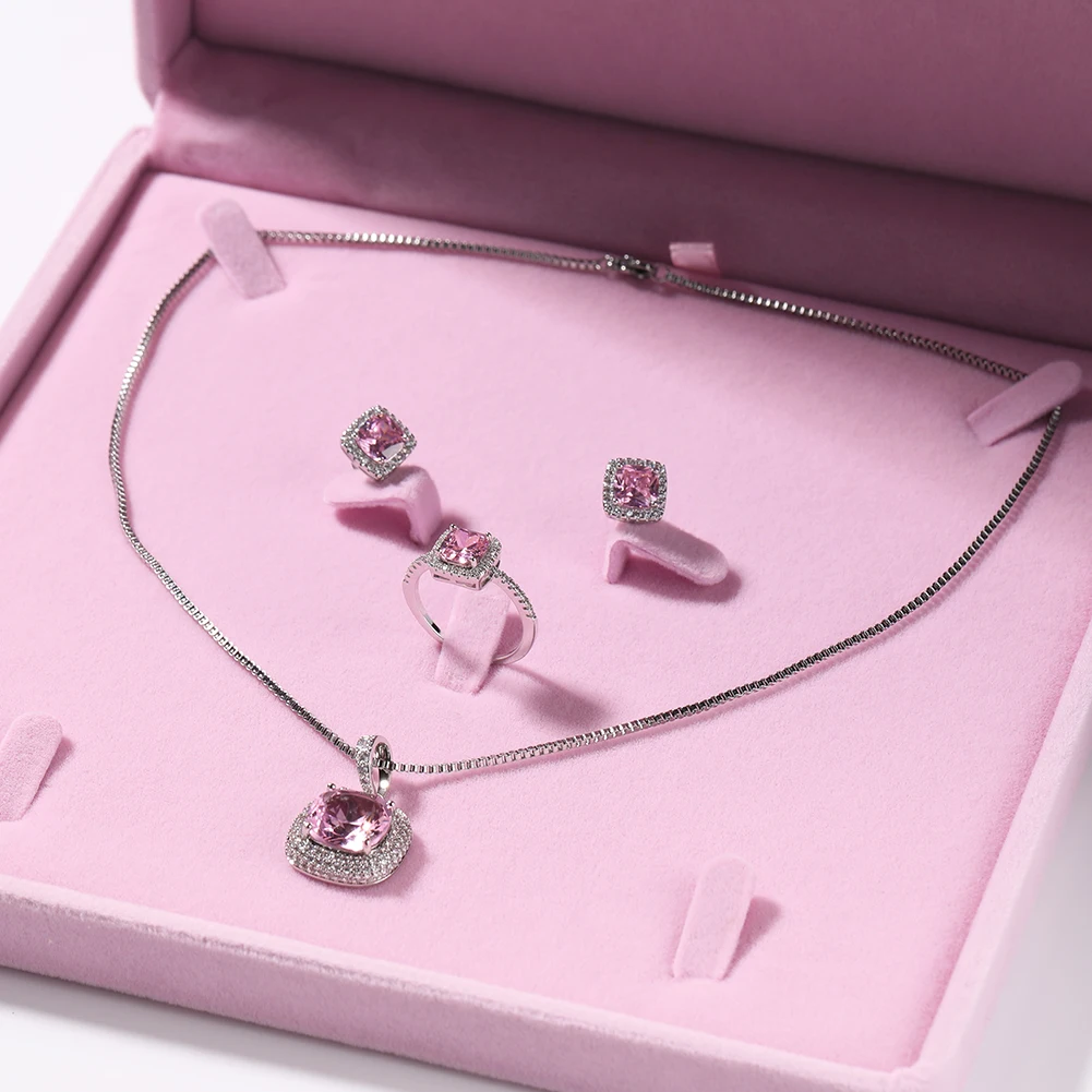 Baguette Pink CZ Necklace Earring Ring Gemstone Square Stone Hip Hop Jewelry Set Women Men Gift