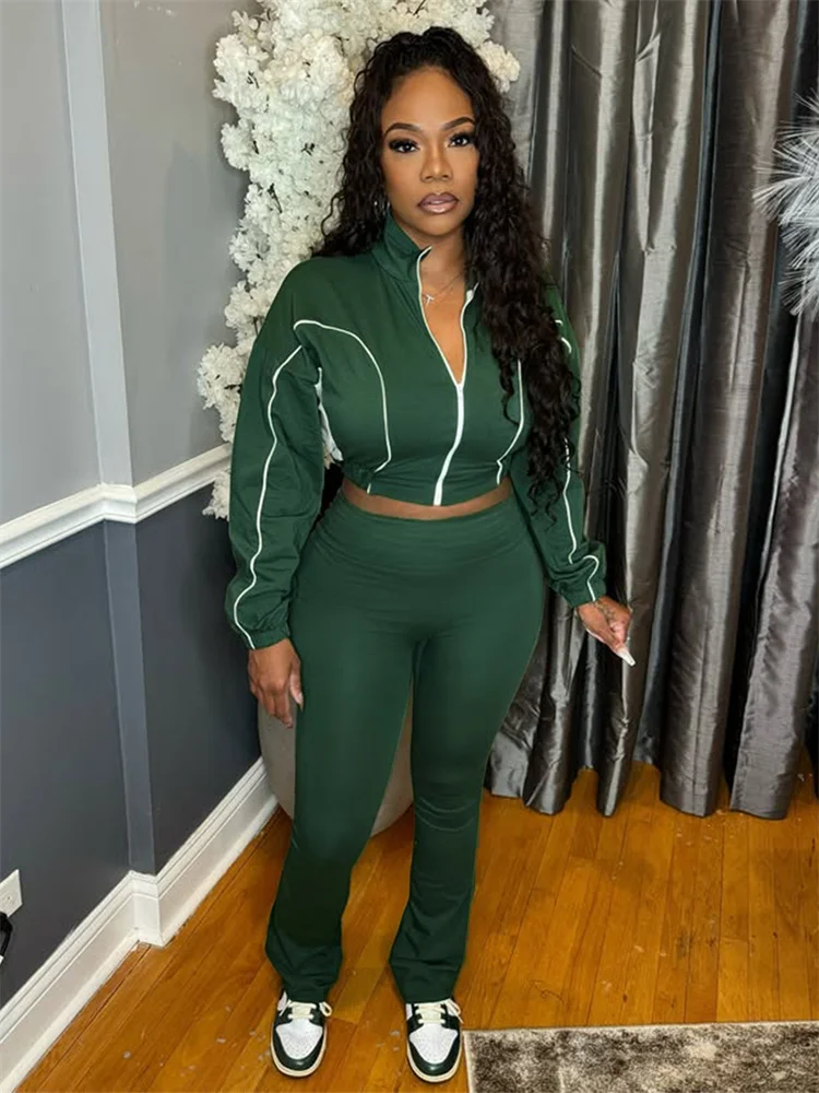 Weird Puss Casual 2 Piece Set Women Tracksuit Patchwork Full Sleeve Zip Elastic Hem Crop Jacket+Flared Pants Sporty Streetwear