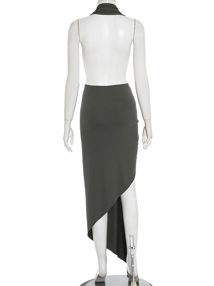 Weird Puss Elegant Halter Backless Dress Women Deep V-Neck Sleeveless Slit Irregular Party Banquet Activity Stretch Clubwear