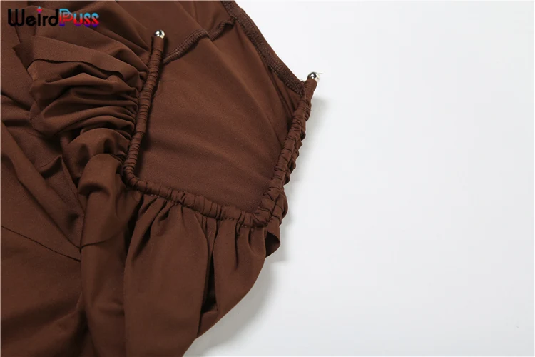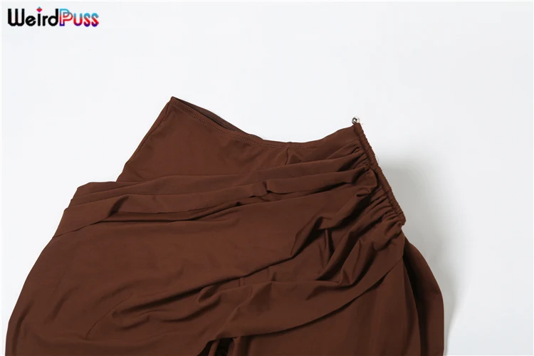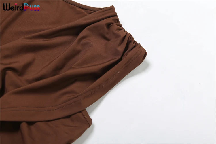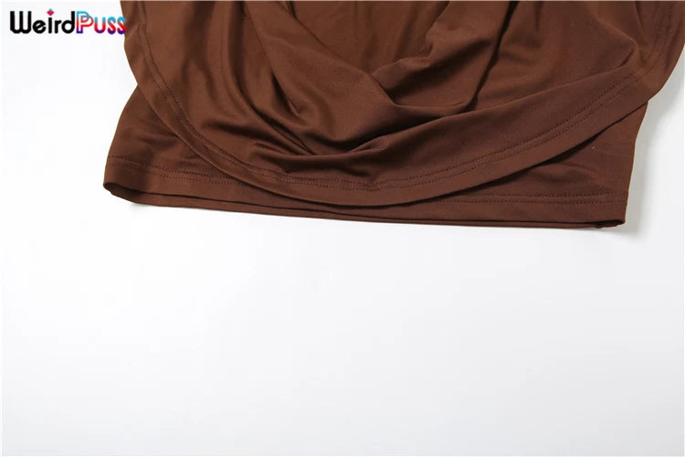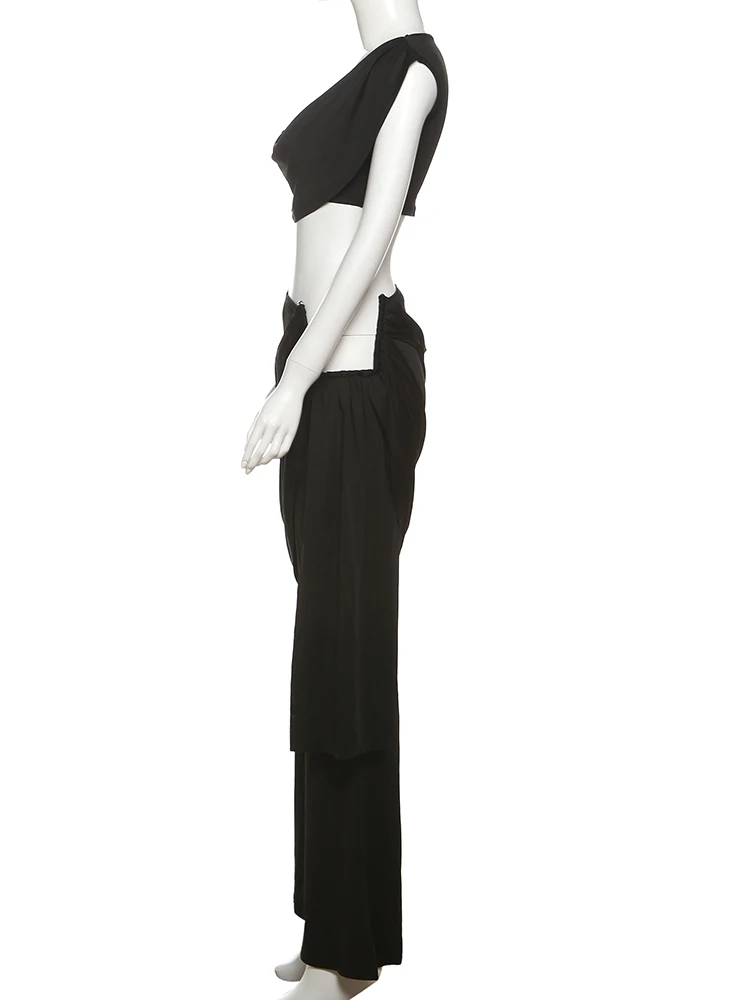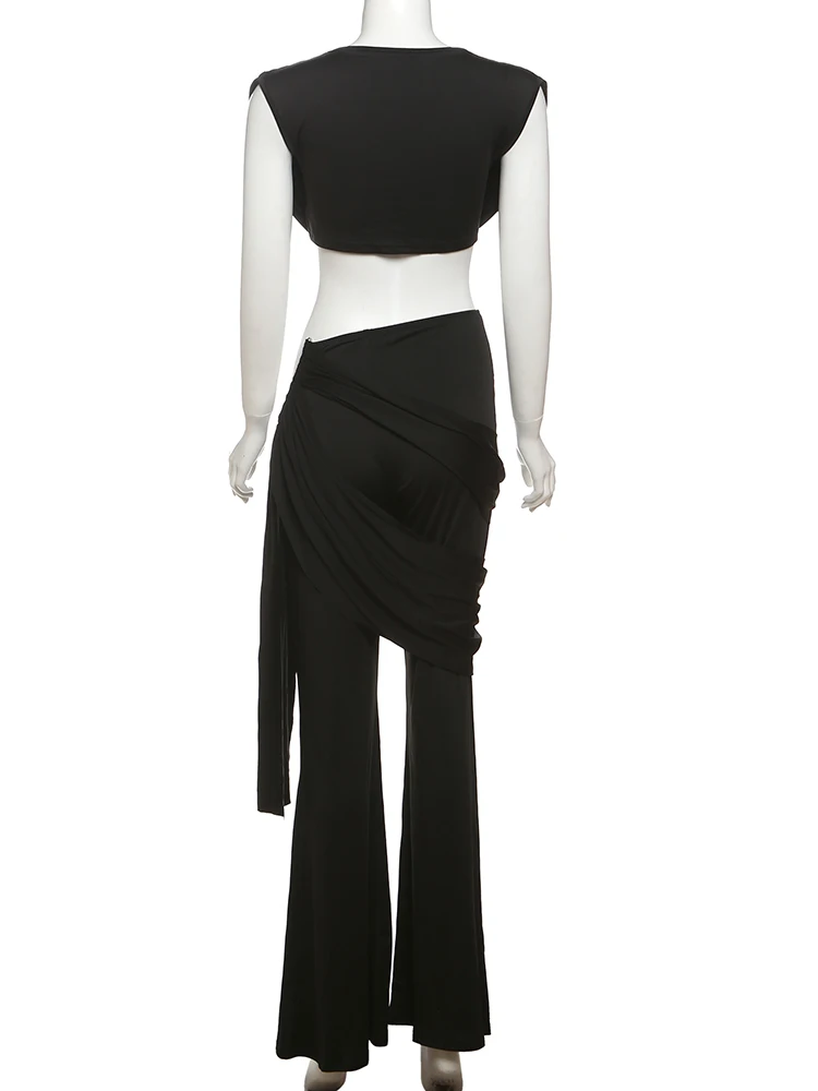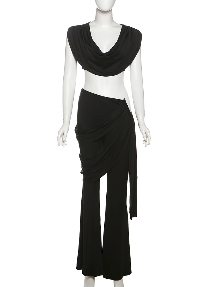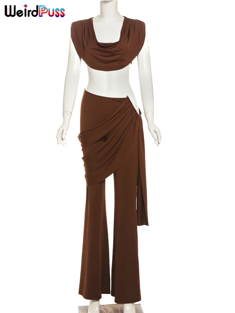 Weird Puss Pleats Elegant 2 Piece Set Women Sexy Low Neck Sleeveless Crop Tops+Irregular Waist Tassel Straight pants Solid Suit