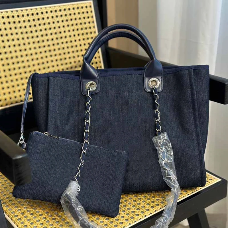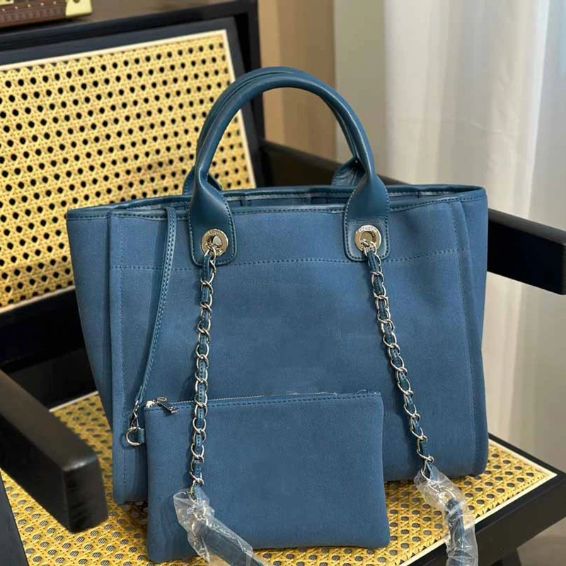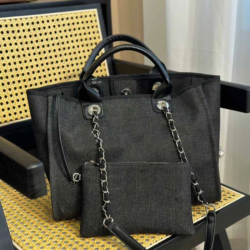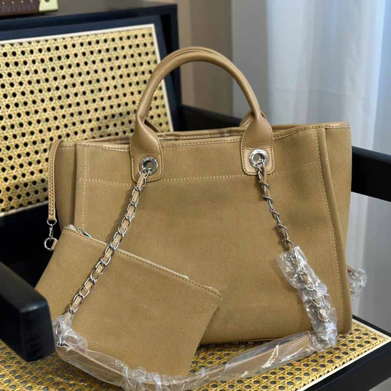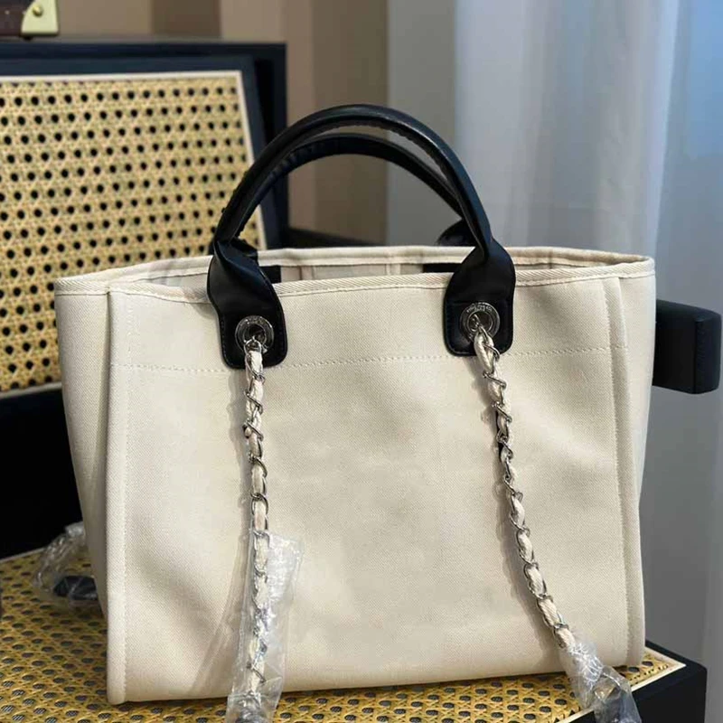 Wholesale chains strap leather handle canvas beach tote bags large capacity shopping bags luxury women handbags
