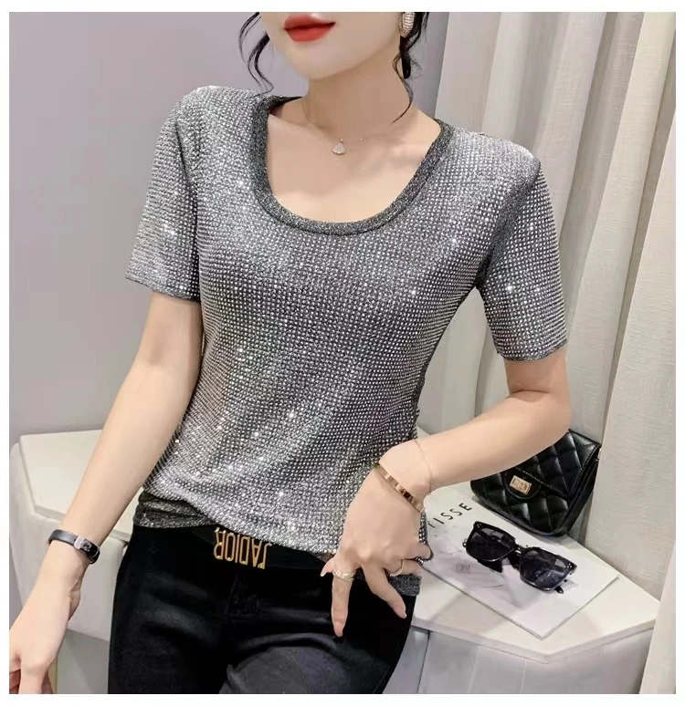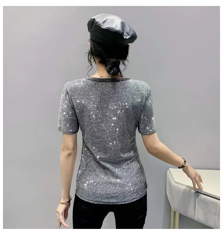 Women Summer Clothing Bling Bling Rhinestone T-shirts Women Black Silver Diamond T-shirts