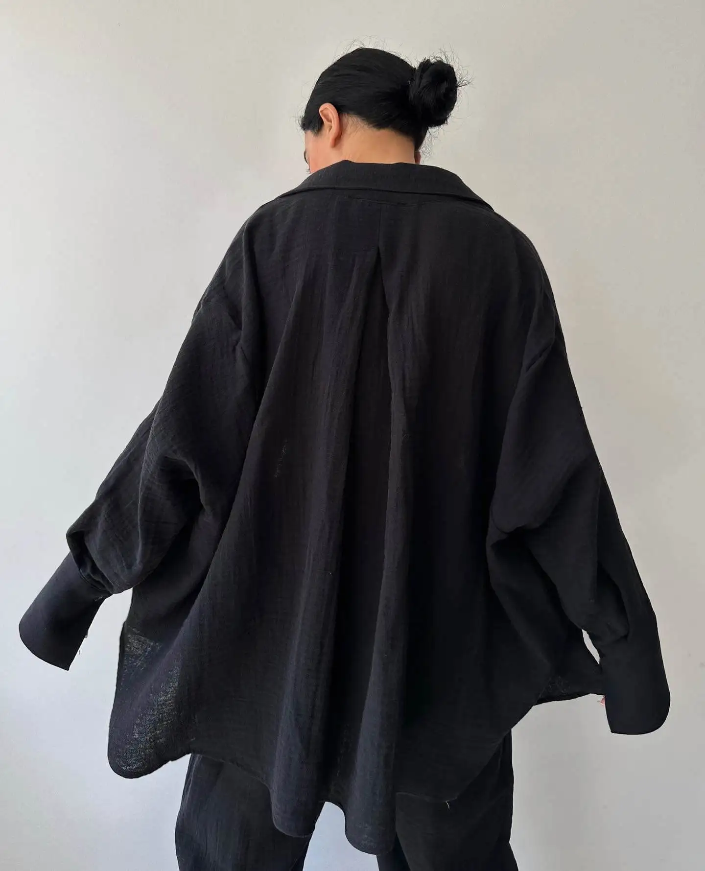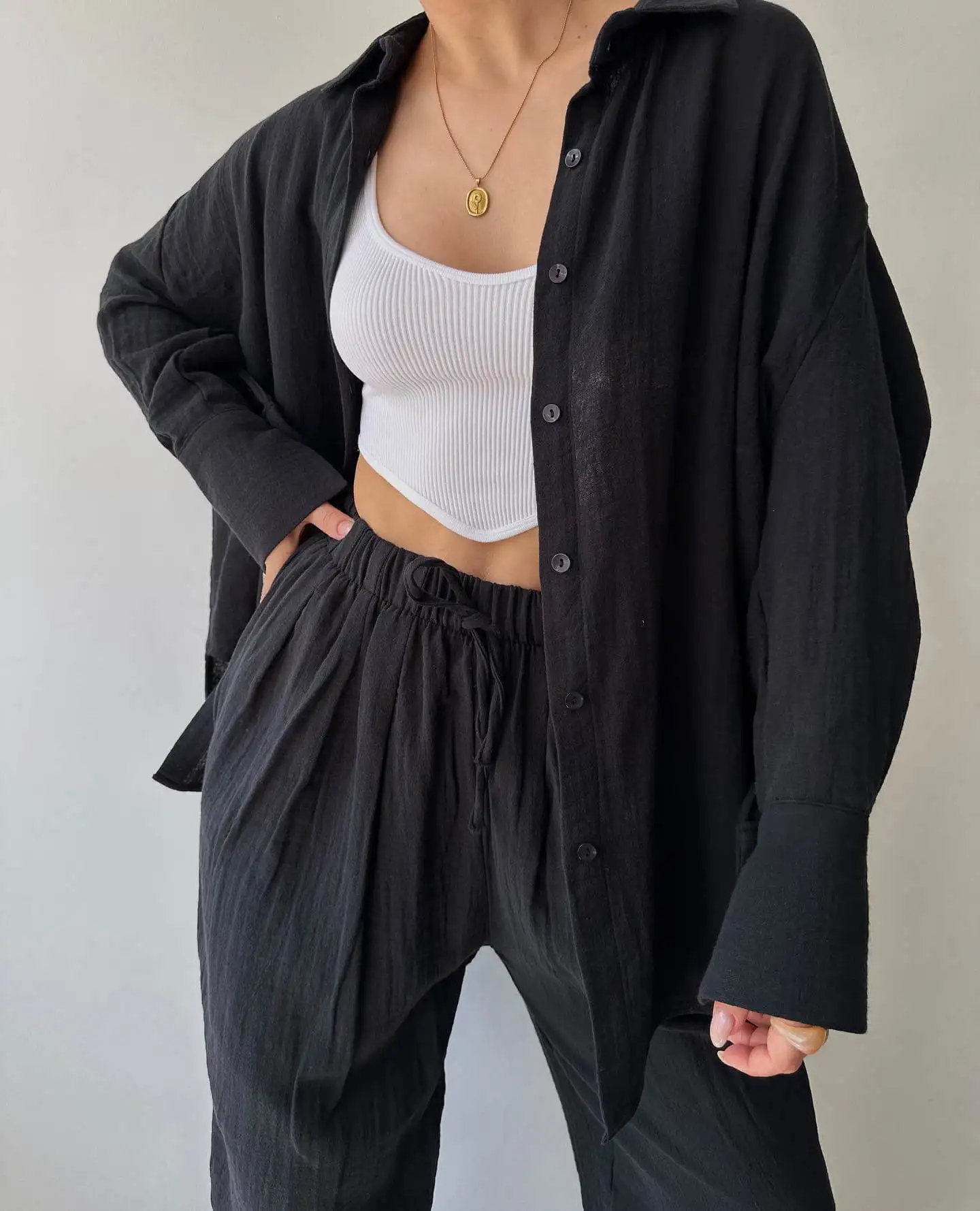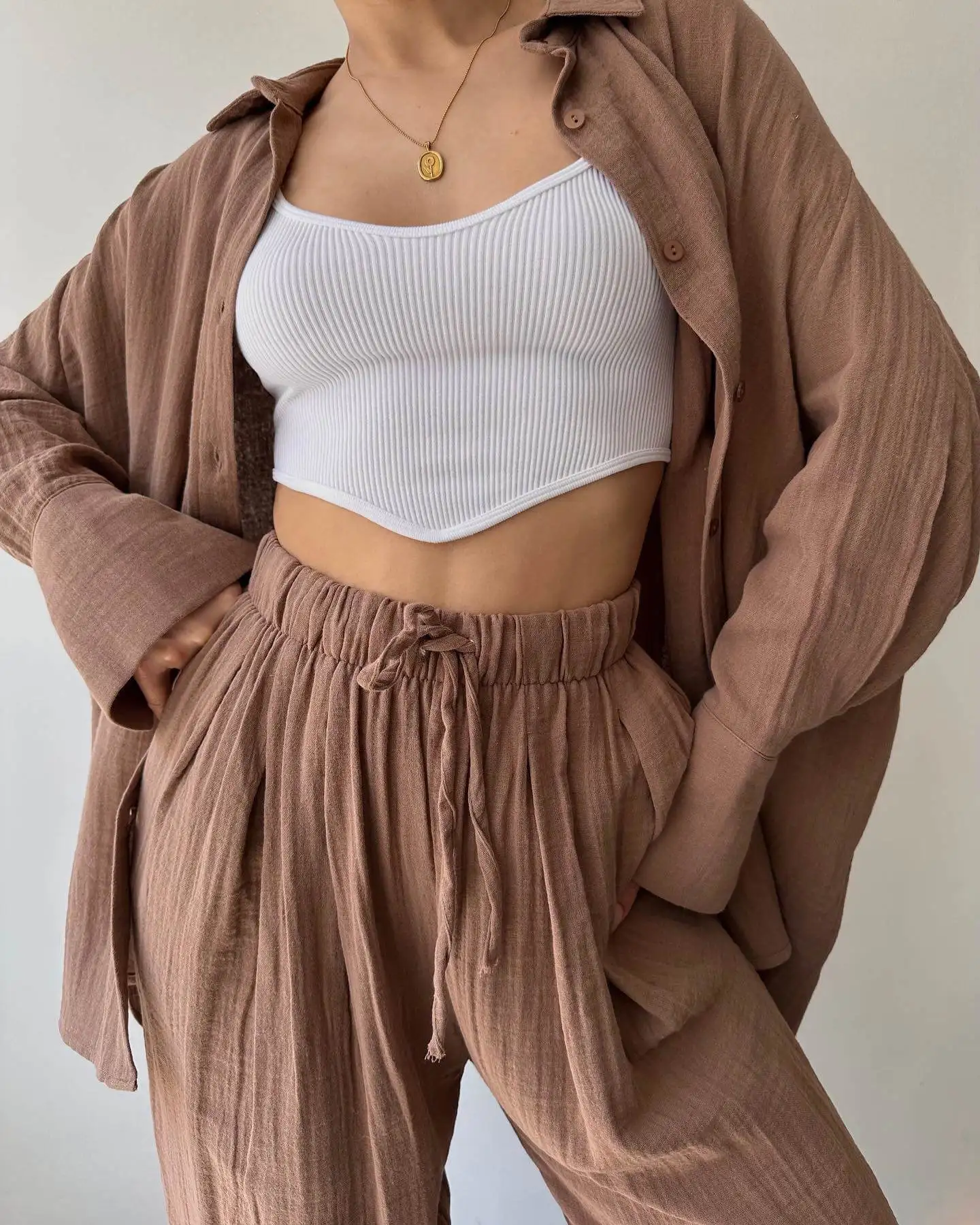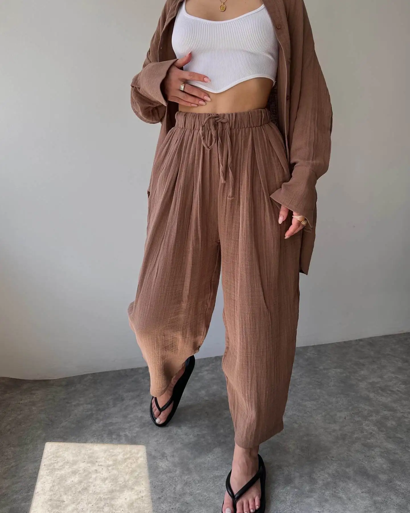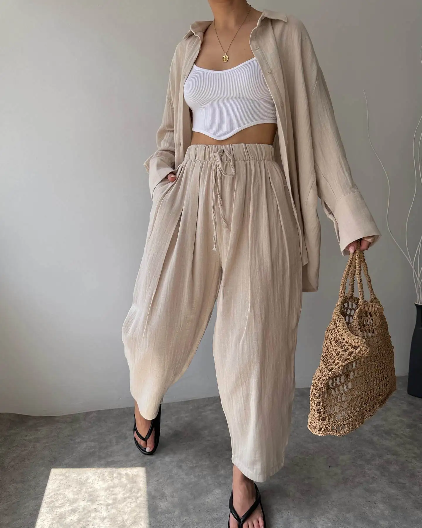 Women's clothing 2023 autumn new minimalist collar long sleeved shirt high waisted pants casual set