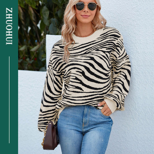 2022 Autumn Casual O Neck Contrast Color Zebra Patchwork Pullover Knitting Tops Women Fashion Streetwear Coat Sweater For Ladies