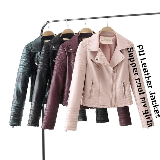 Locomotive Biker Jacket Stripe Straight Sleeve 4 Zipper PU Leather Plus Size S-3XL Women Regular Zip Up Coat