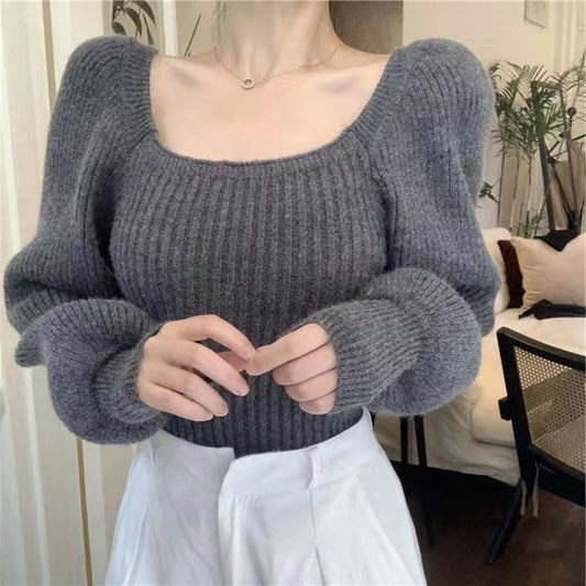 S-XXL Summer and Winter New Loose Long sleeved Top Lazy Square Neck Bubble Lantern Sleeve Knitted Sweater Women's Coat