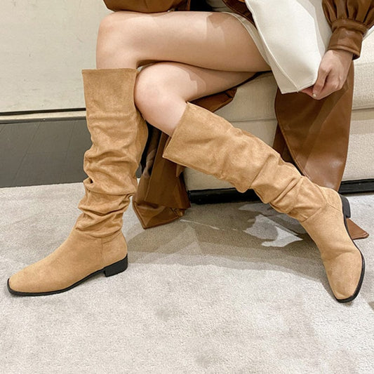 Spring Autumn Leather Thick Soled Boots Fashion Lace-up Side Zippers Round Head Knee-High Motorcycle 35-39 Boots For Women