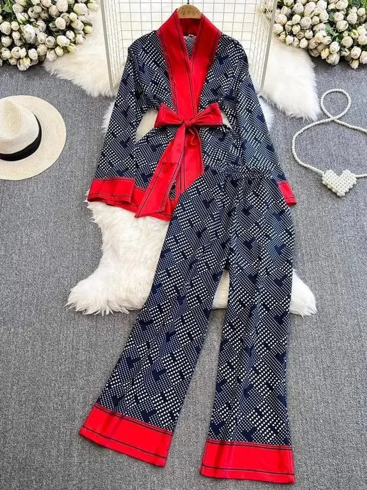 Women Contrast Dot Print V-Neck Loose Lace Up Top+Elastic Waist Wide Leg Pant Suit Autumn Fashion Kimono Cardigan Two Piece Set