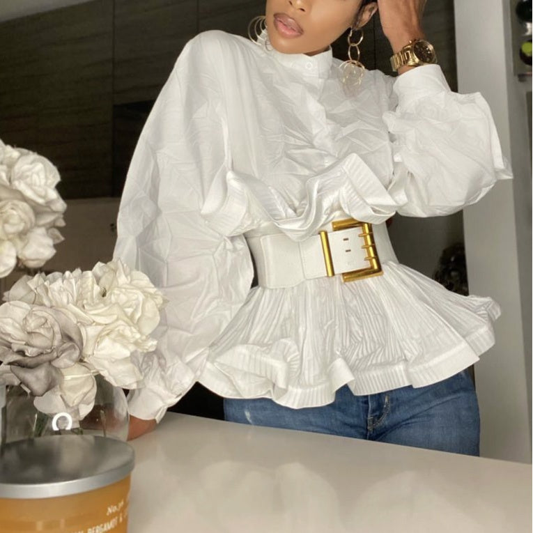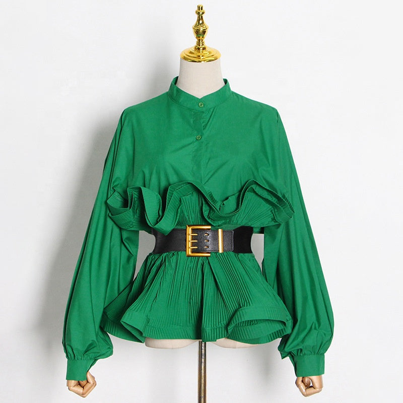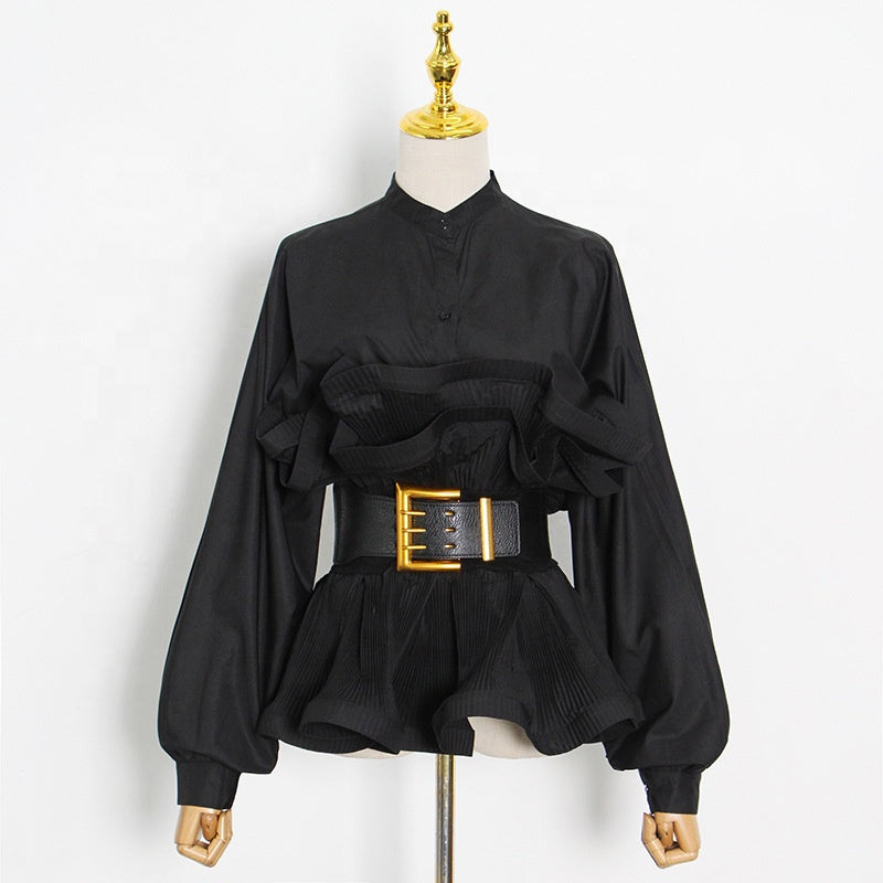 2022 Streetwear elegant puff sleeves blouse tops with belt stand collar ruffle ladies shirts blouses tops women
