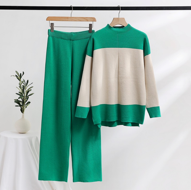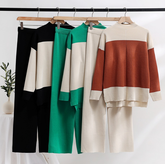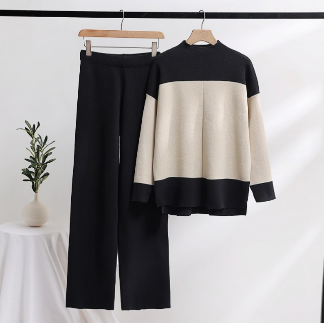 2023 Autumn and winter casual color contrast suit knit sweater wide-leg pants two-piece set