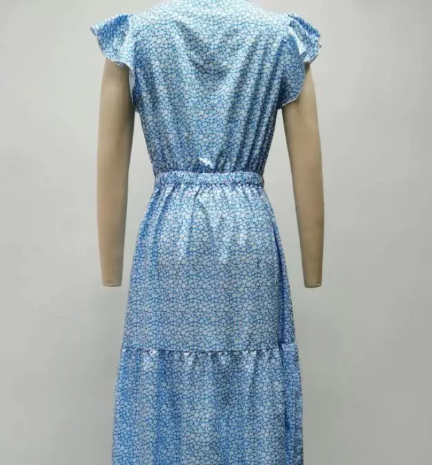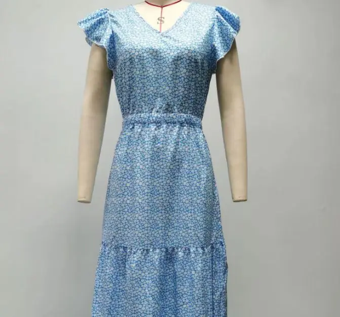 2024 European Summer High Waist Solid Color Short Floral Sleeve Long Loose Dress Print Puffy Skirt Casual Dress