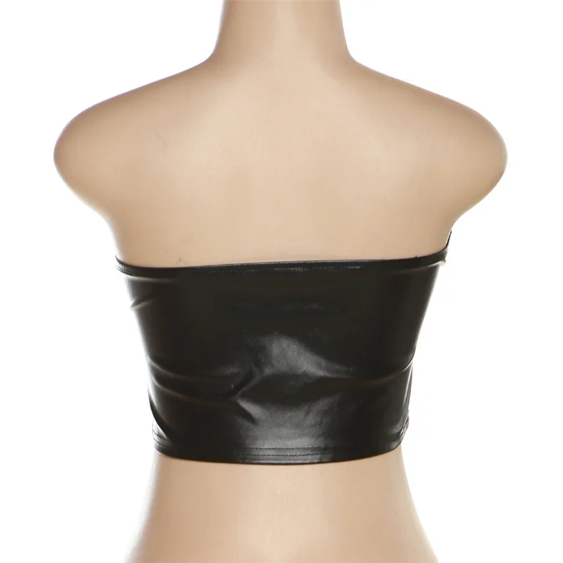 2024 New Summer Women 2pcs Pu Dress Set Solid Color Off Shoulder Sleeveless V Neck Crop Top+pocket Metal Buckle Mini Skirt