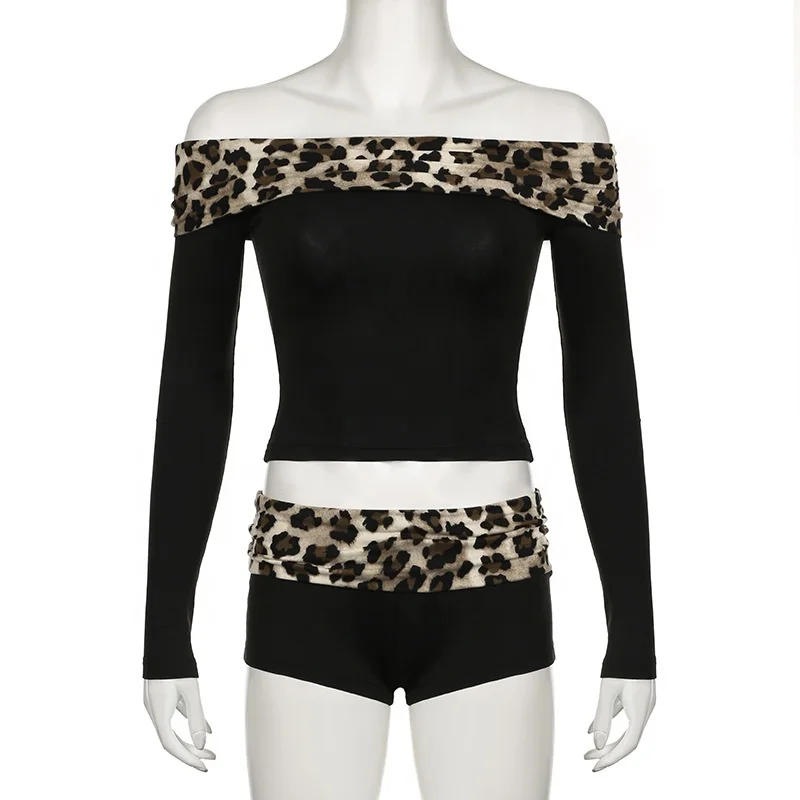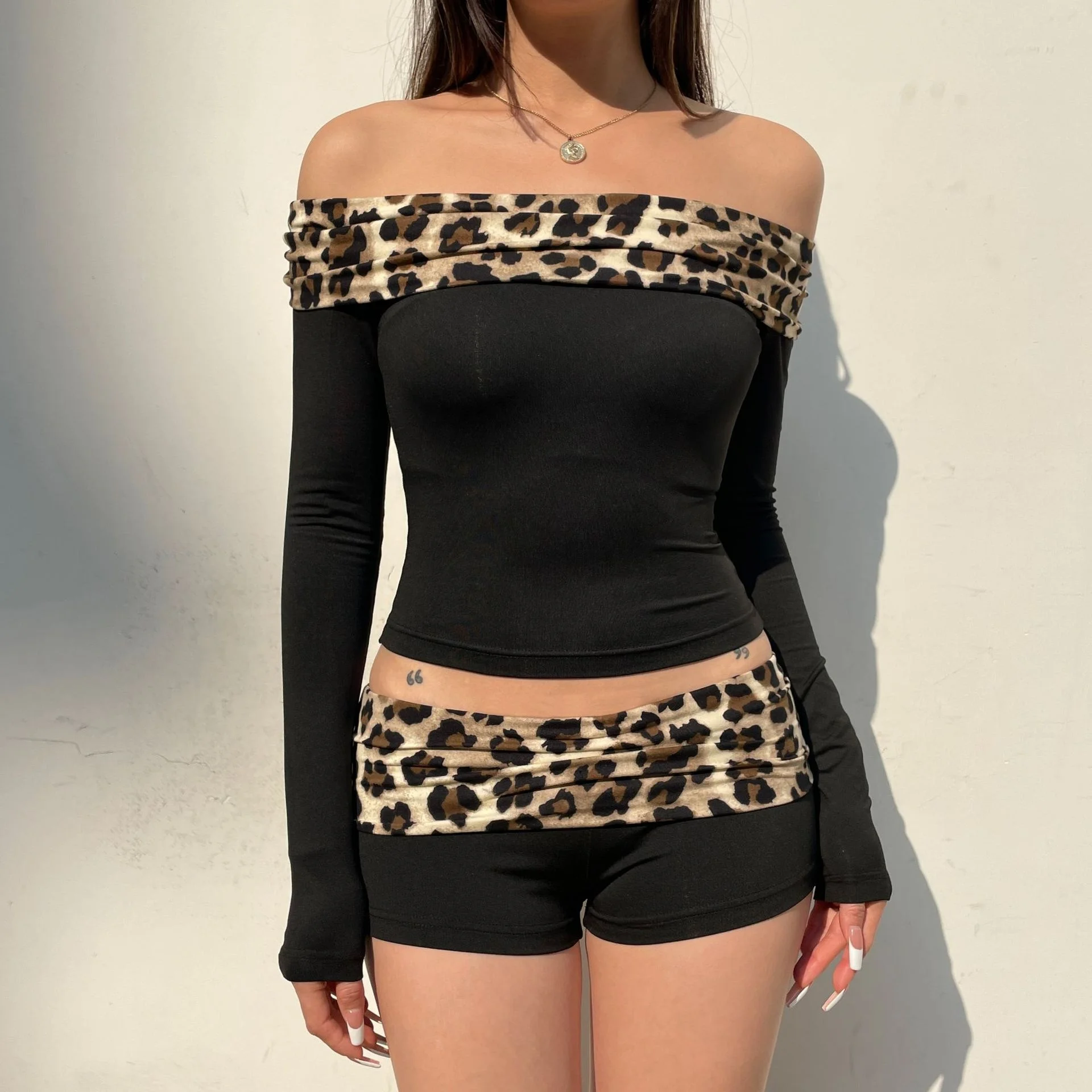 2024 Spring New Arrivals Leopard Pattern Patchwork One Shoulder Long Sleeved Top With Tight Micro Flared Pants Casual Set
