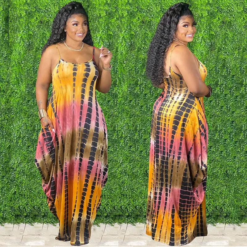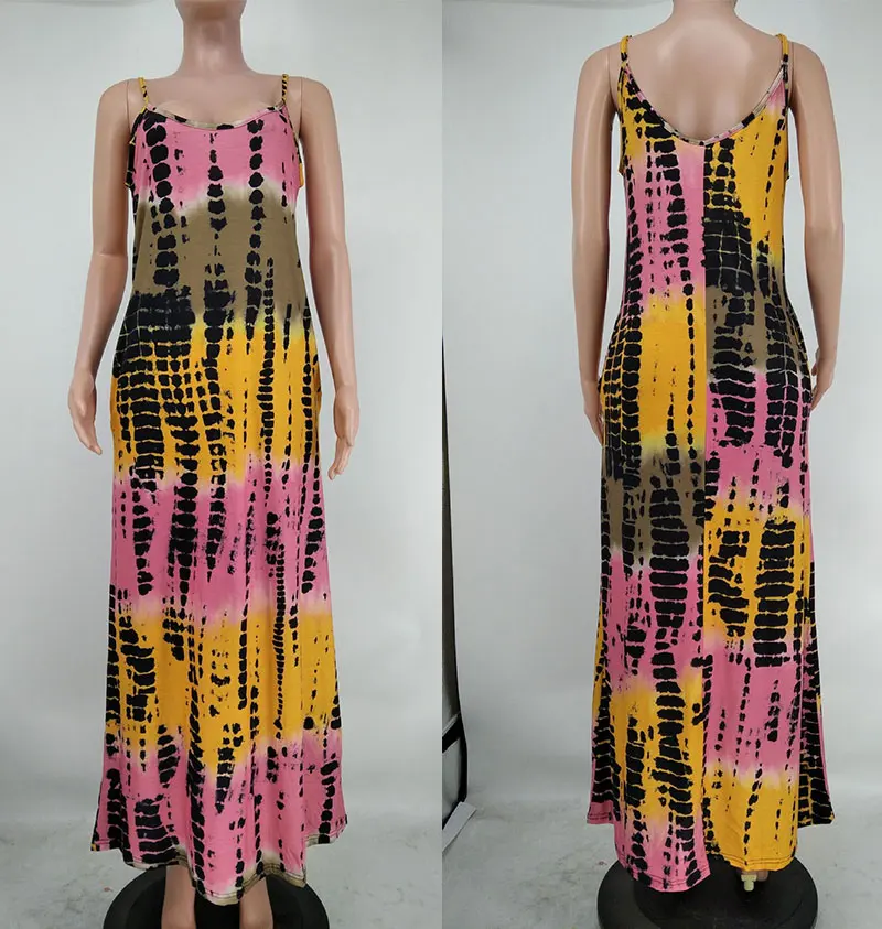 2024 Summer Sexy Fashionable Floral Clothes Tie-Dye Multicolored Print Halter Loose Dress Maxi Long Dresses Women