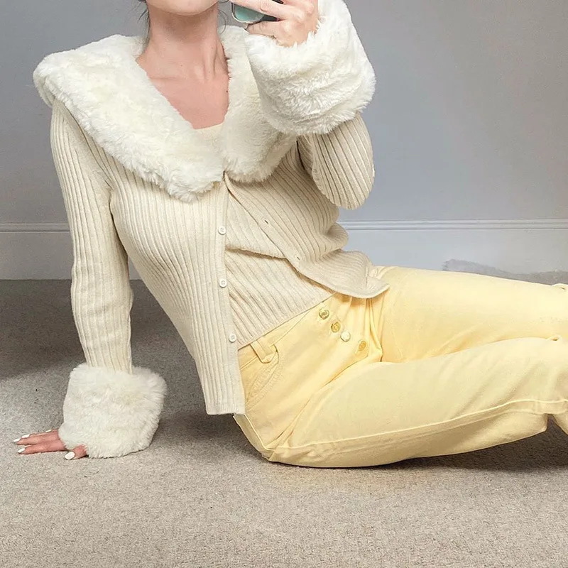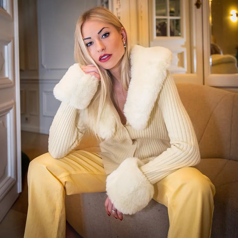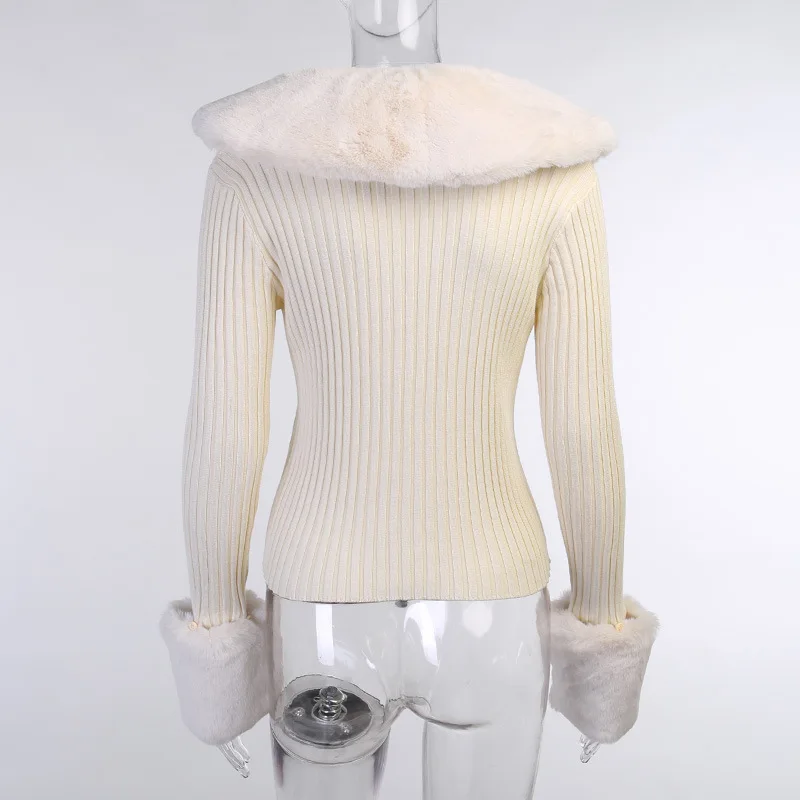 2024 winter new long sleeve top sexy wool collar knitted solid color cardigan