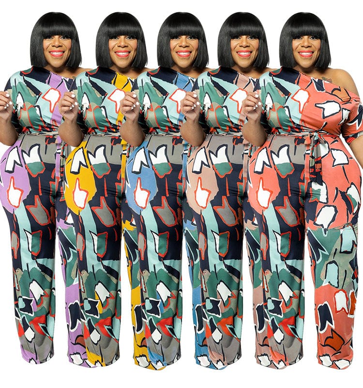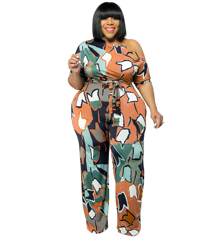 Amazon New Big Size 3XL 4XL 5XL Summer New Slanted Shoulder Printed Loose Jumpsuit with Belt