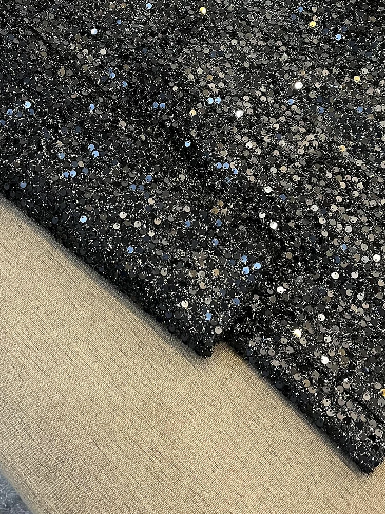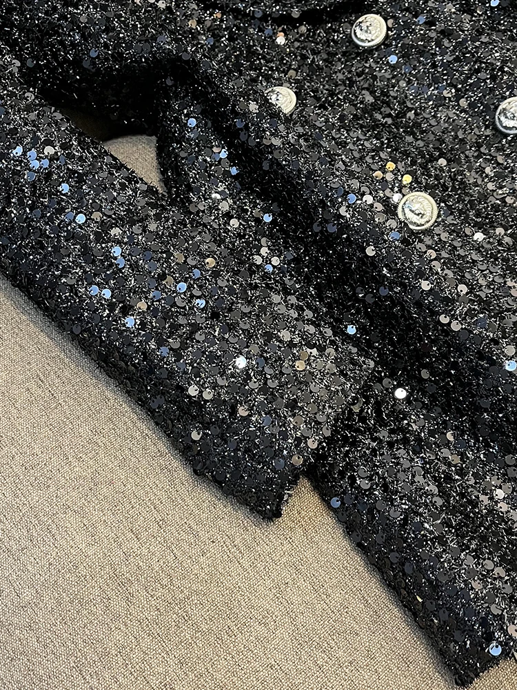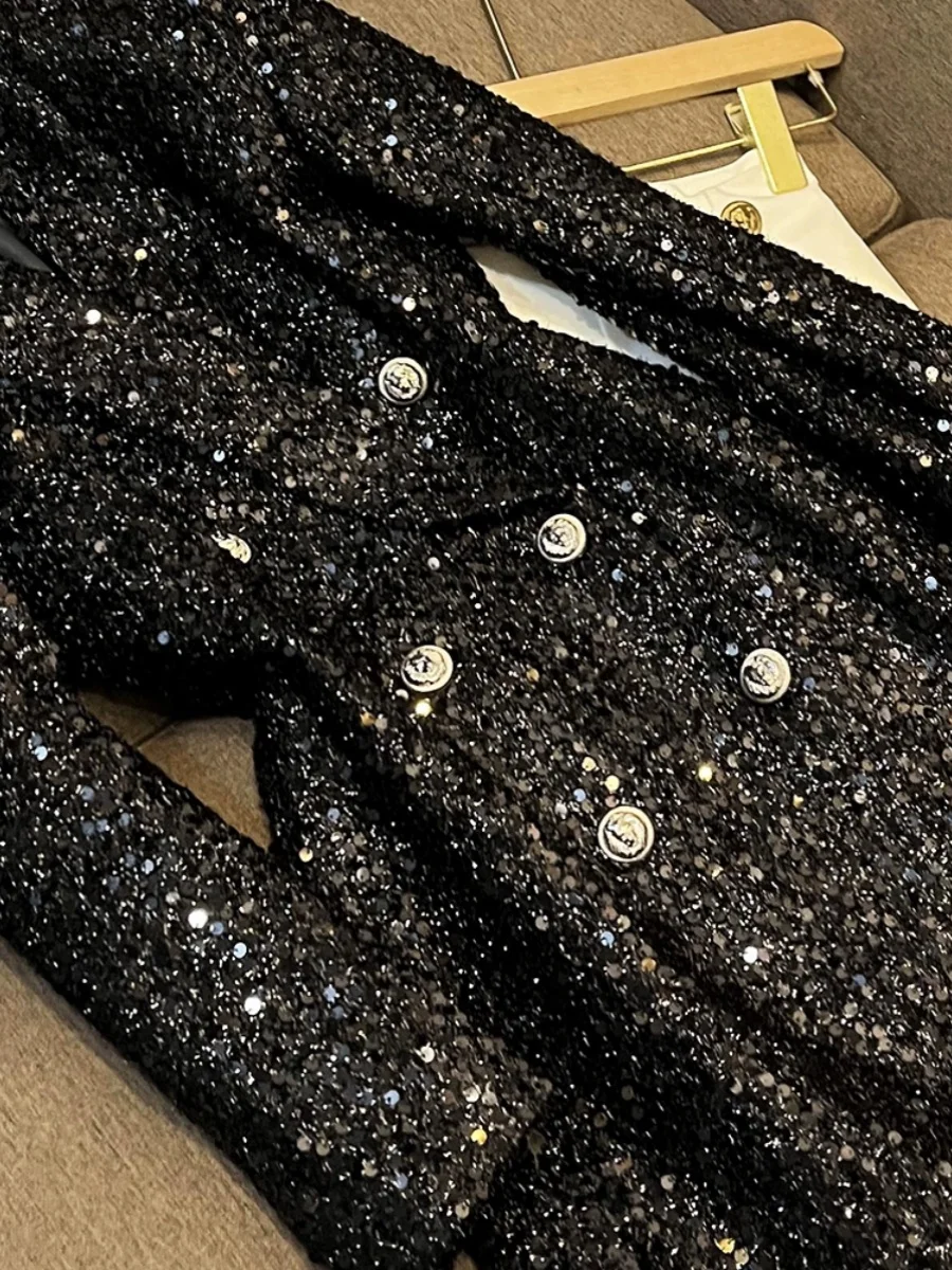 Autumn Winter Fine Workmanship All-over Shinny Sequins Designed Lady Midi Coat Women Long Sleeve Double-breasted Blazer Black