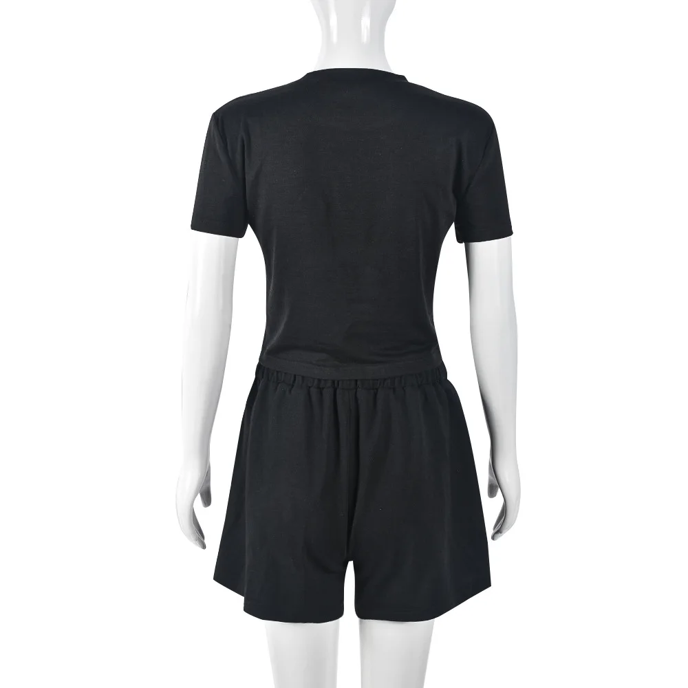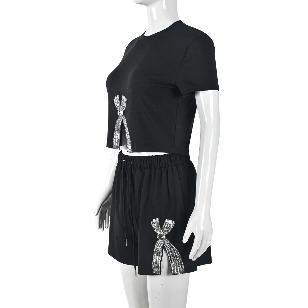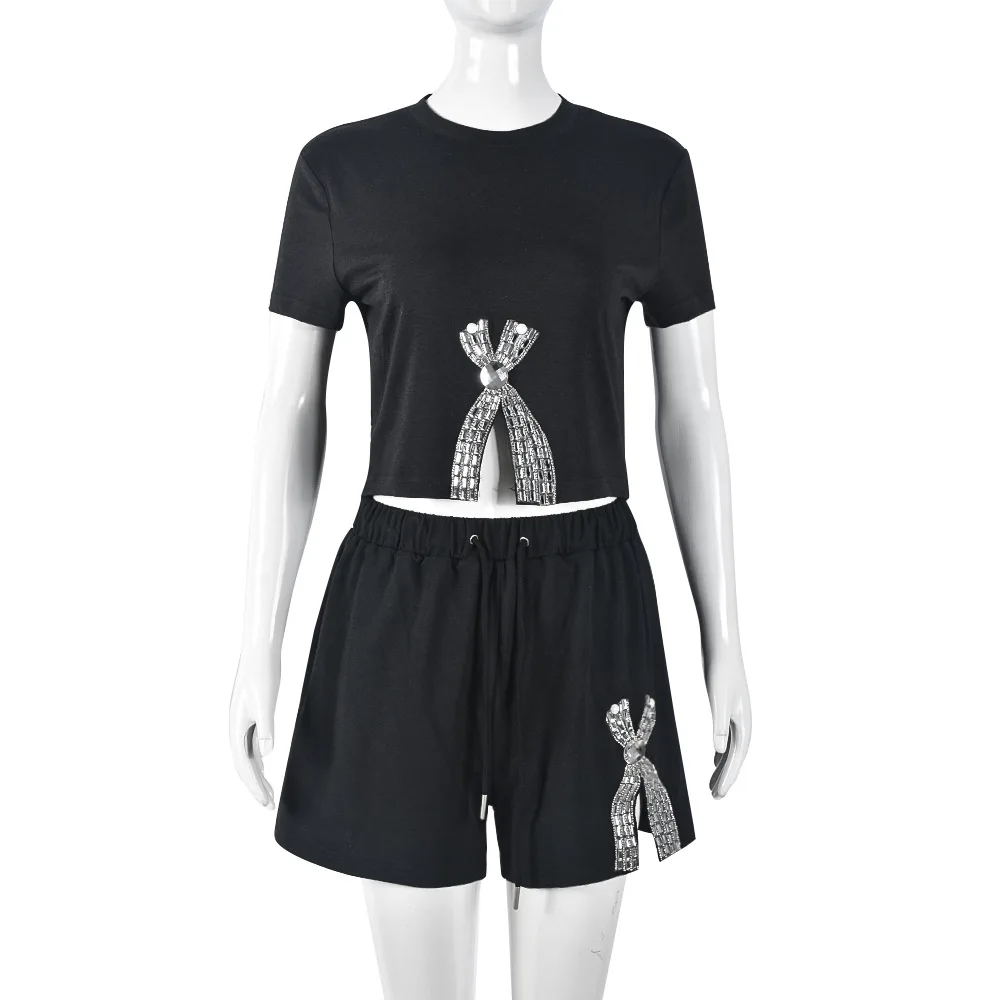 BH1109 2024 women summer new crop lace up hot diamond round neck two piece shorts set