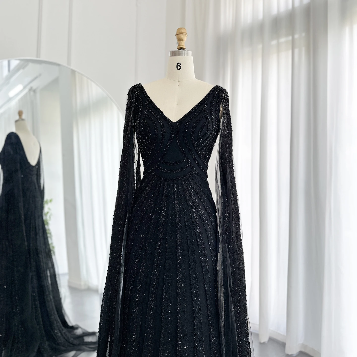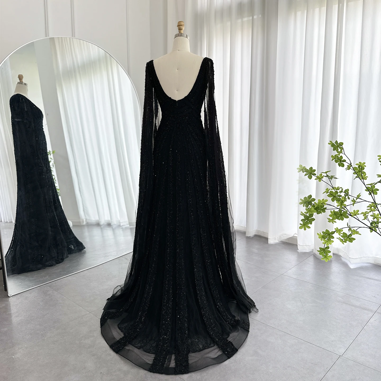 Black Arabic Mermaid Evening Dresses With Cape Sleeves 2023 Luxury Beaded Dubai For Women Wedding Party Gowns Sz218