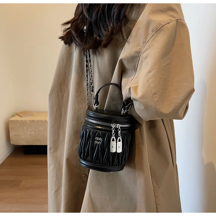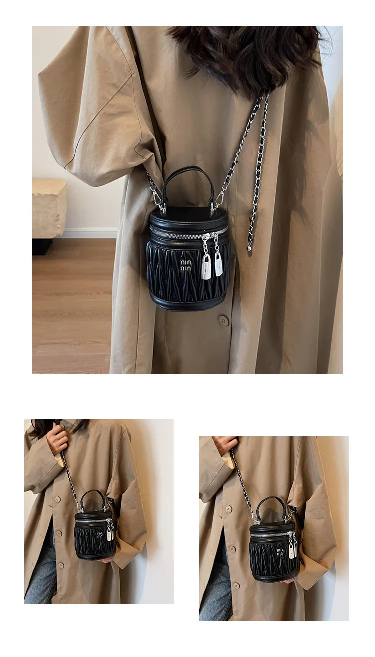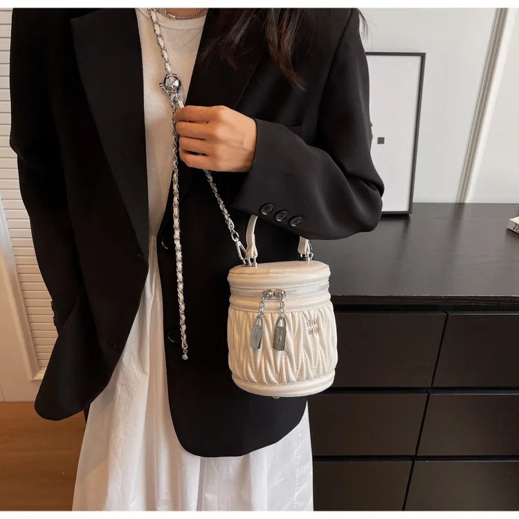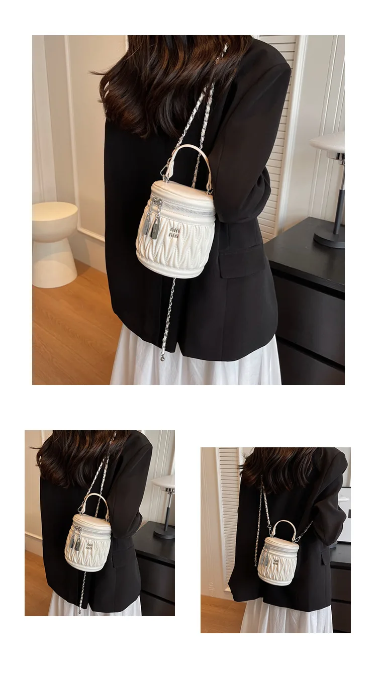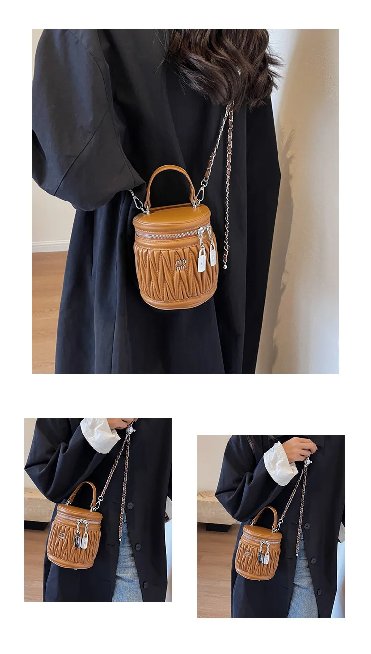 Brand New Fashion Pleated Embroidered Thread Bucket Ruched Luxury Shoulder Messenger Bag Women's Small Barrel Shaped Totes