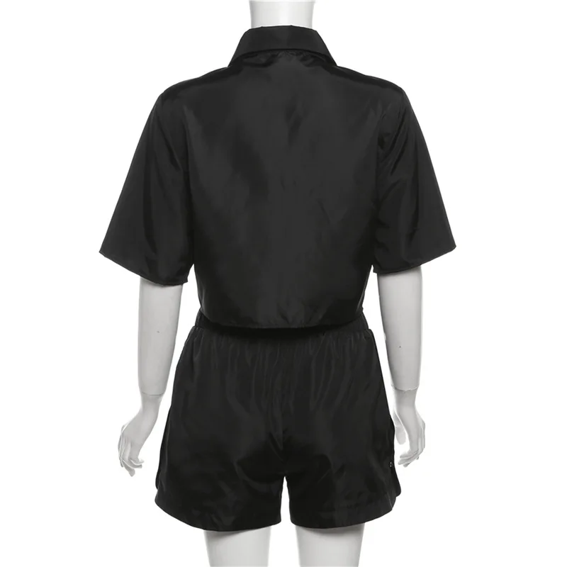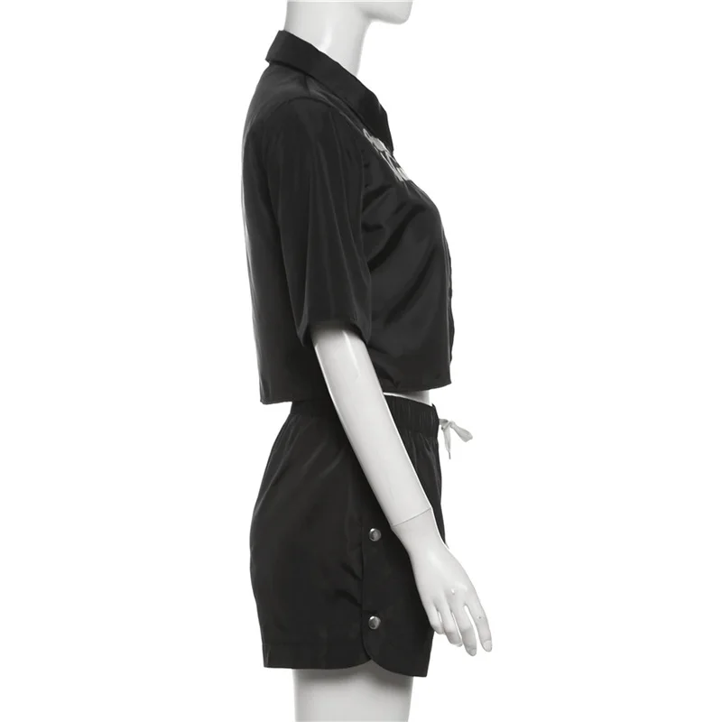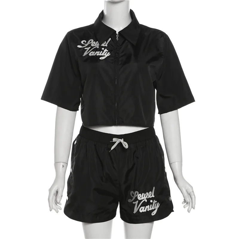 C1194 Summer Fashion Flip Collar Zipper Letter Embroidered High Waist Lace up Shorts Set for Women