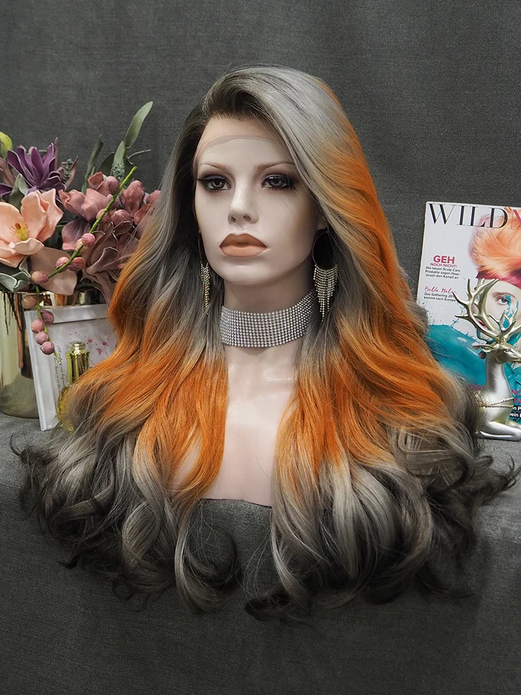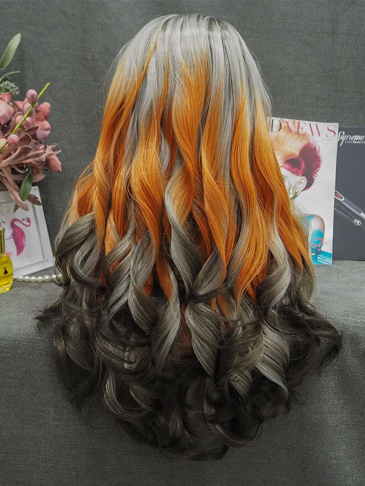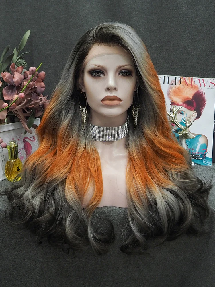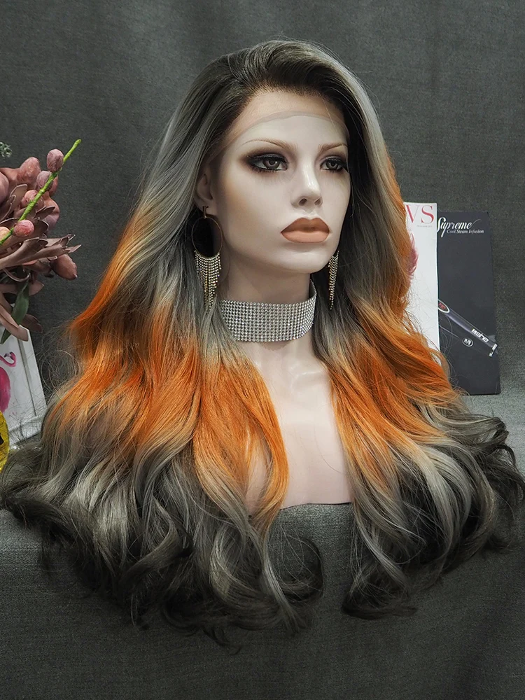 Celebrity Wig New Designed ombre orange gray color Daily life Wearing futura Henlon fiber Synthetic Lace front Wigs