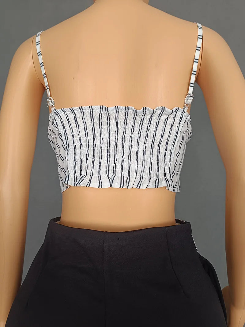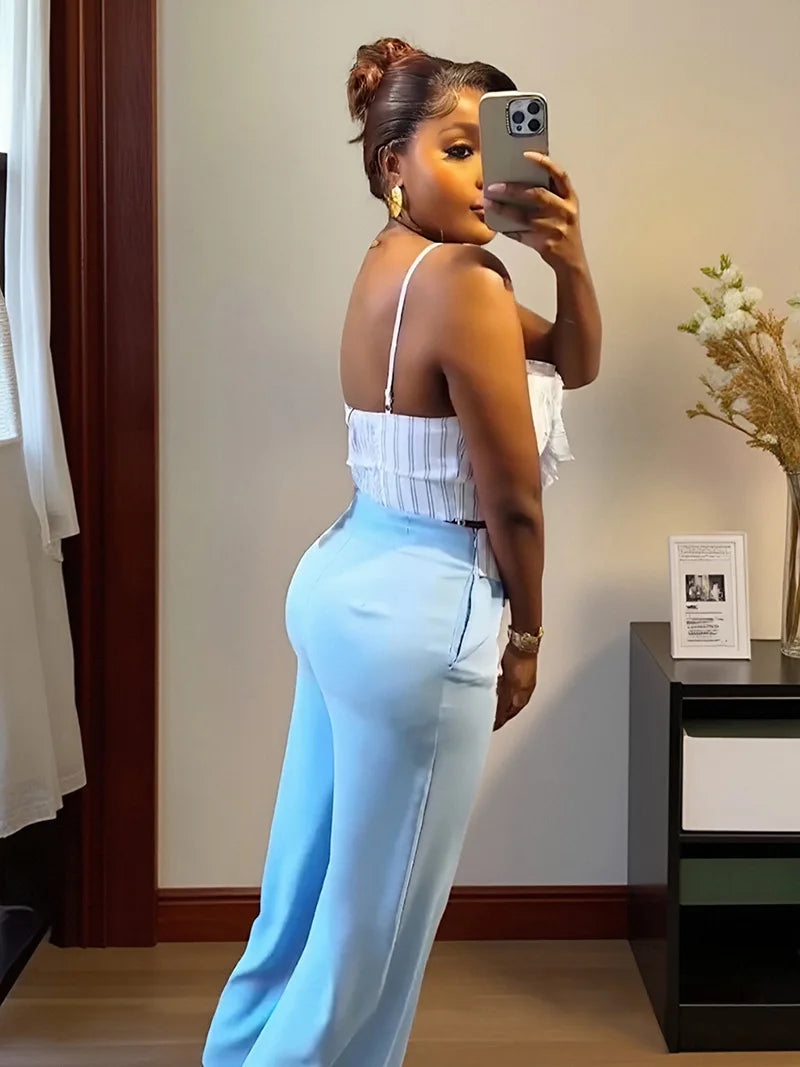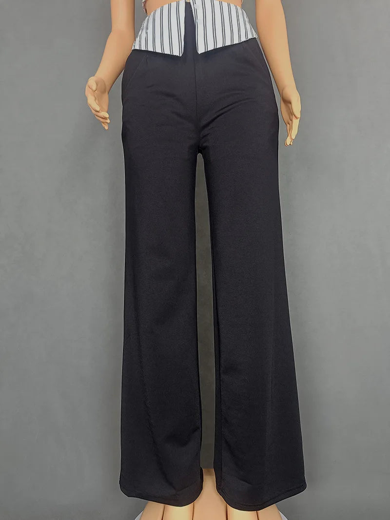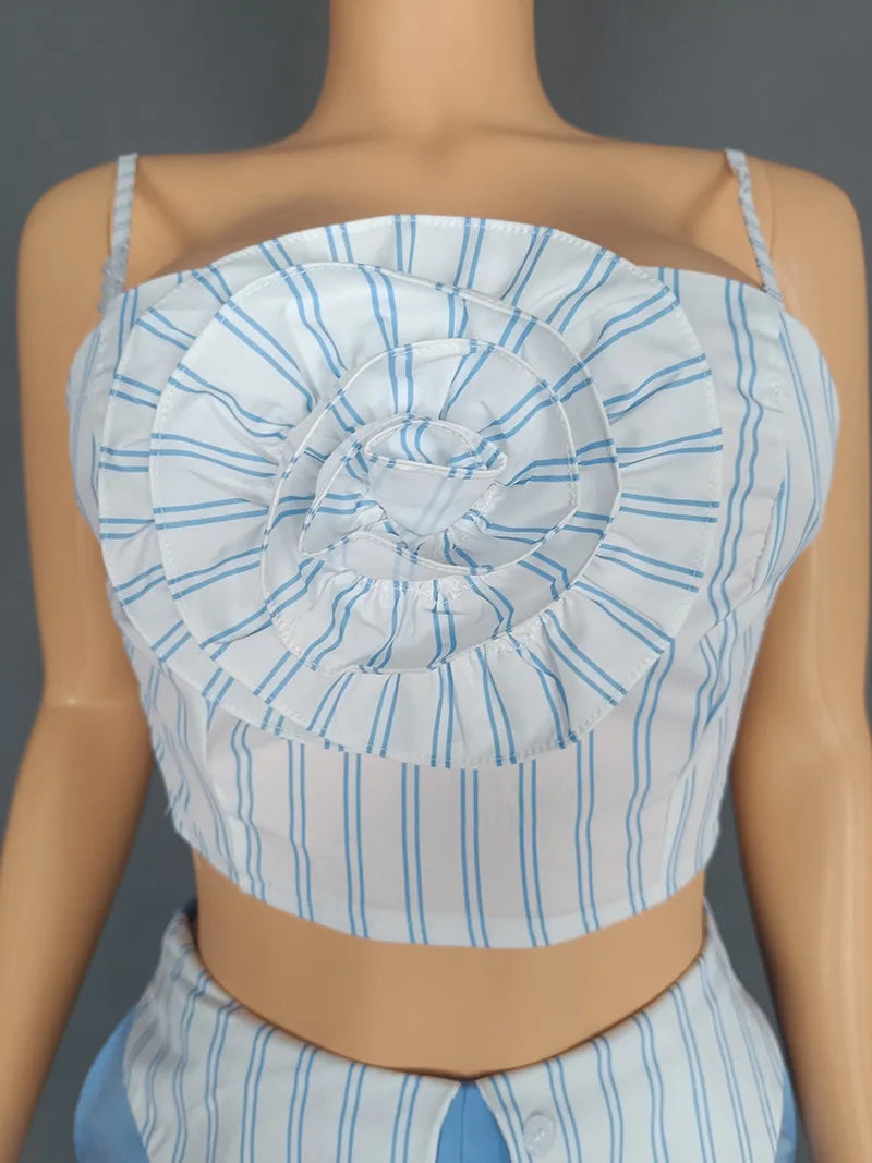 CM.YAYA Fashion Women's Set Striped Strap Floral Applique Crop Top and Wide Leg Pants Suit 2025 Two 2Piece Sets Outfit Tracksuit