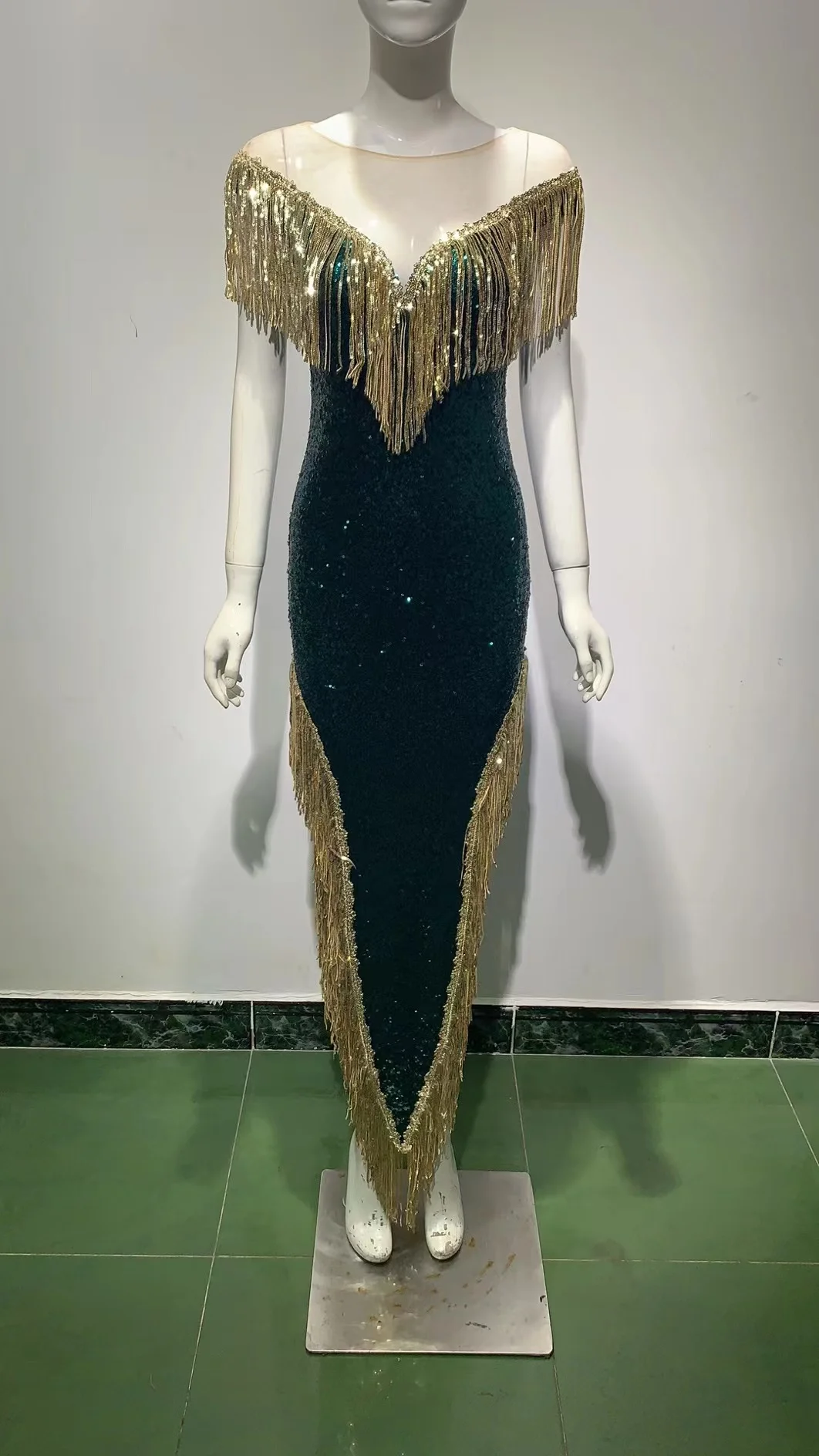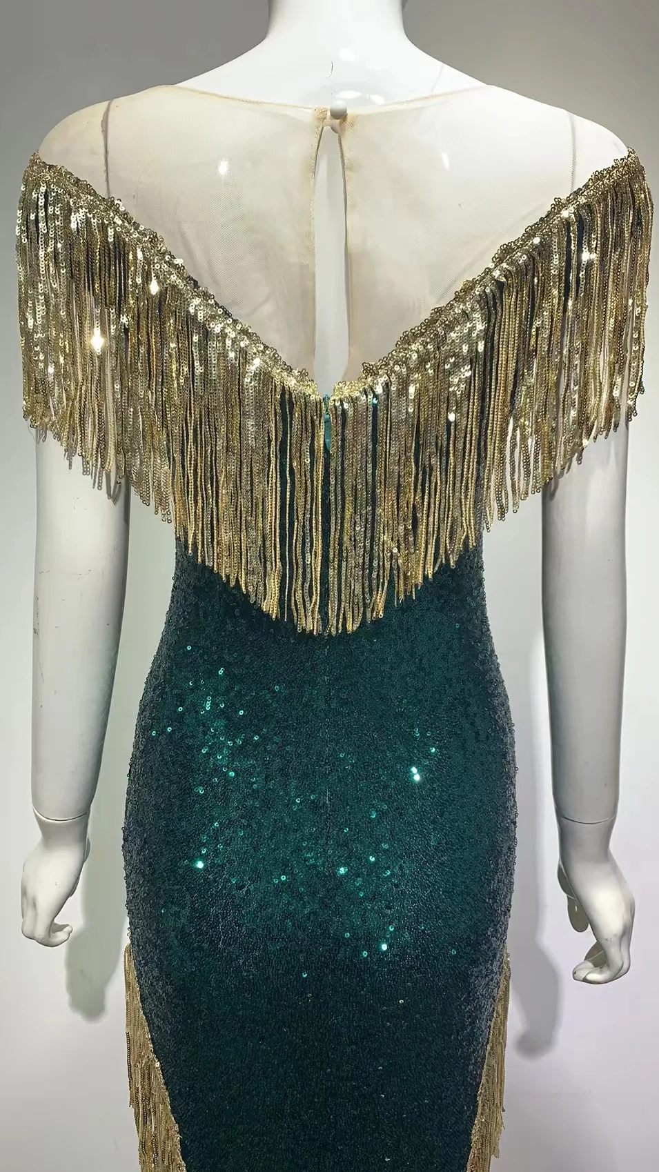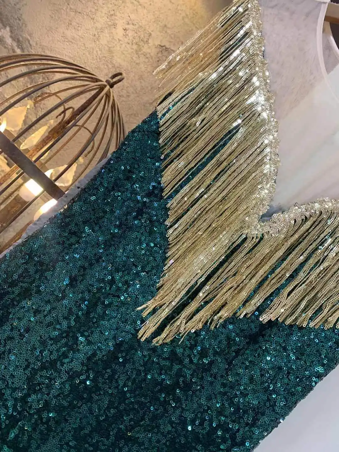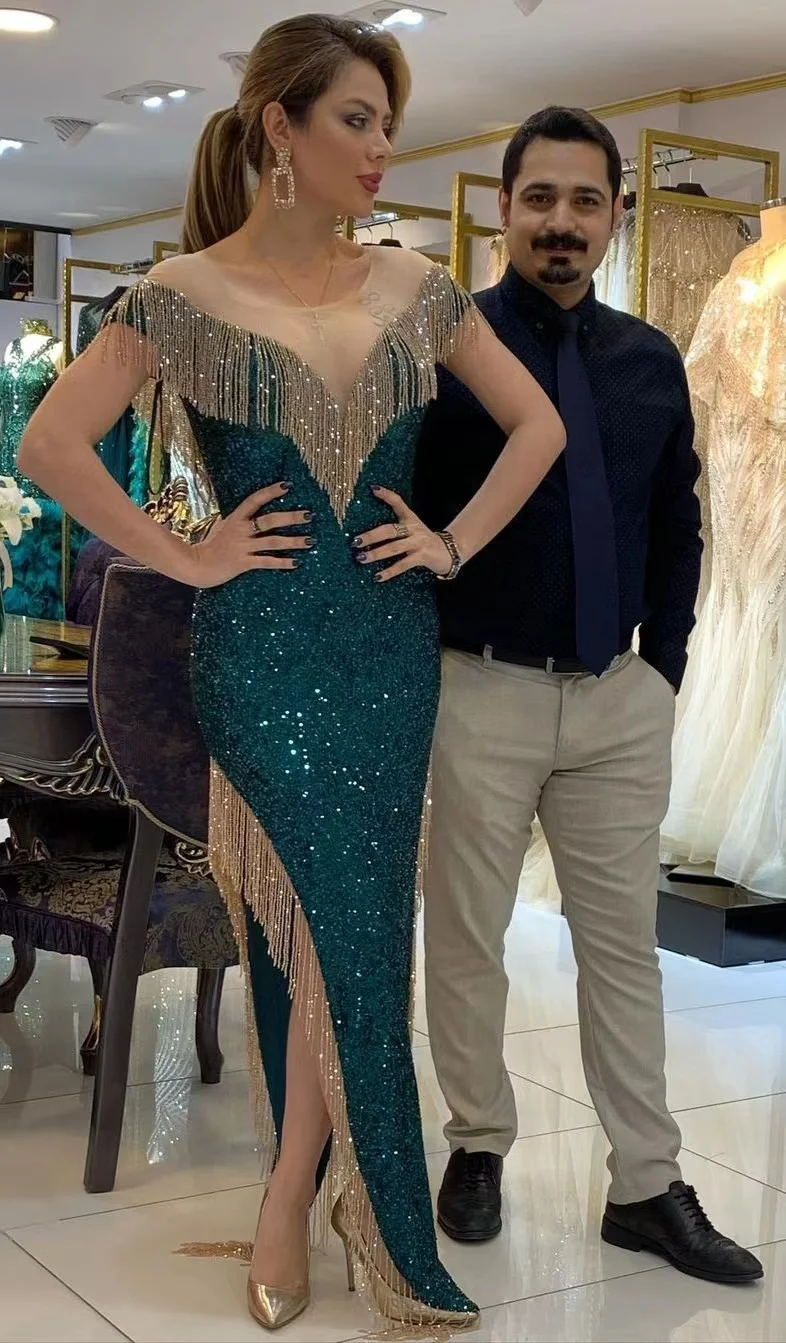 Trendy beading sequined mint sexy slit woman dresses formal elegant party