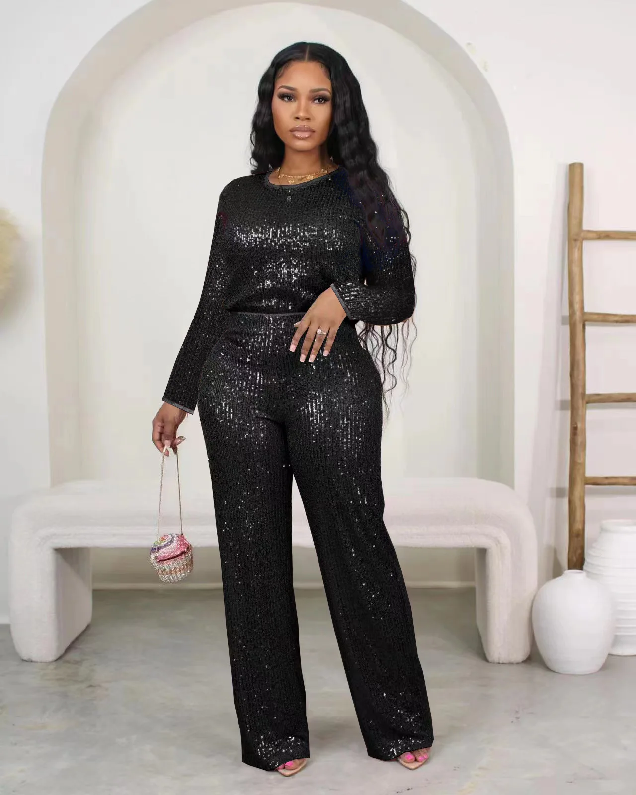 Fall 2024 Fashion Sequin Women Sets Long Sleeve T-Shirt and Wide Leg Dressy Pants Suit Ladies Party Two 2 Piece Formal Outfits