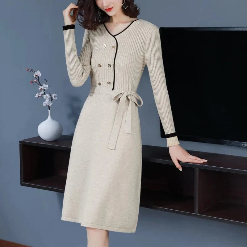 Fashionable women autumn new arrival v neck long sleeve loose waist with belt button decorative women sweater dress