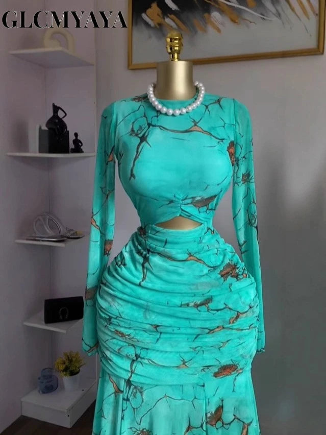 GLCMYAYA 2025 Fall Women O-neck Long Sleeve Print Mermaid Maxi Dress 2025 Evening Birthday Beach Sexy Night Party Long Dresses