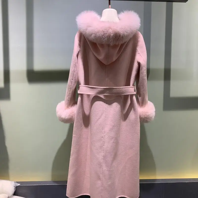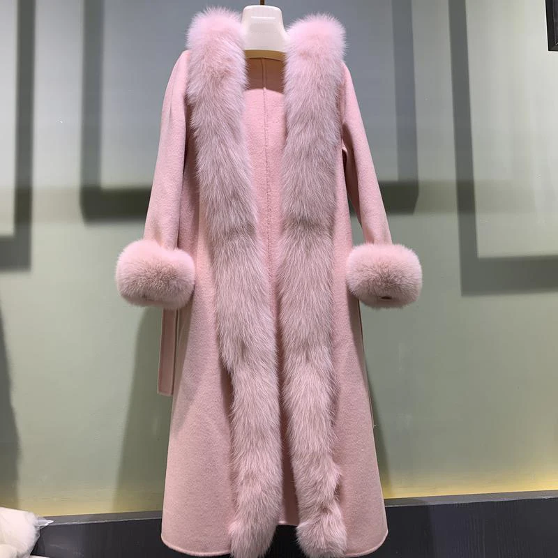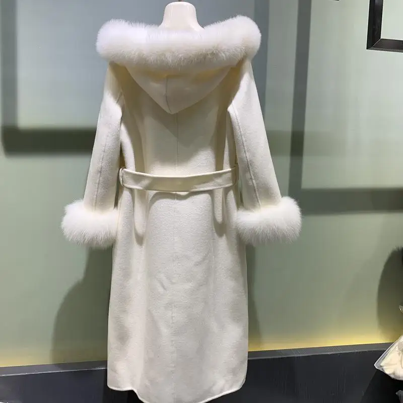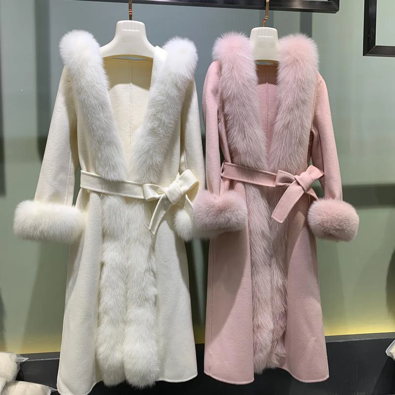 Handmade Belted Cashmere Coat Windproof Long Wool Trench Coat Women With Fox Fur Trim