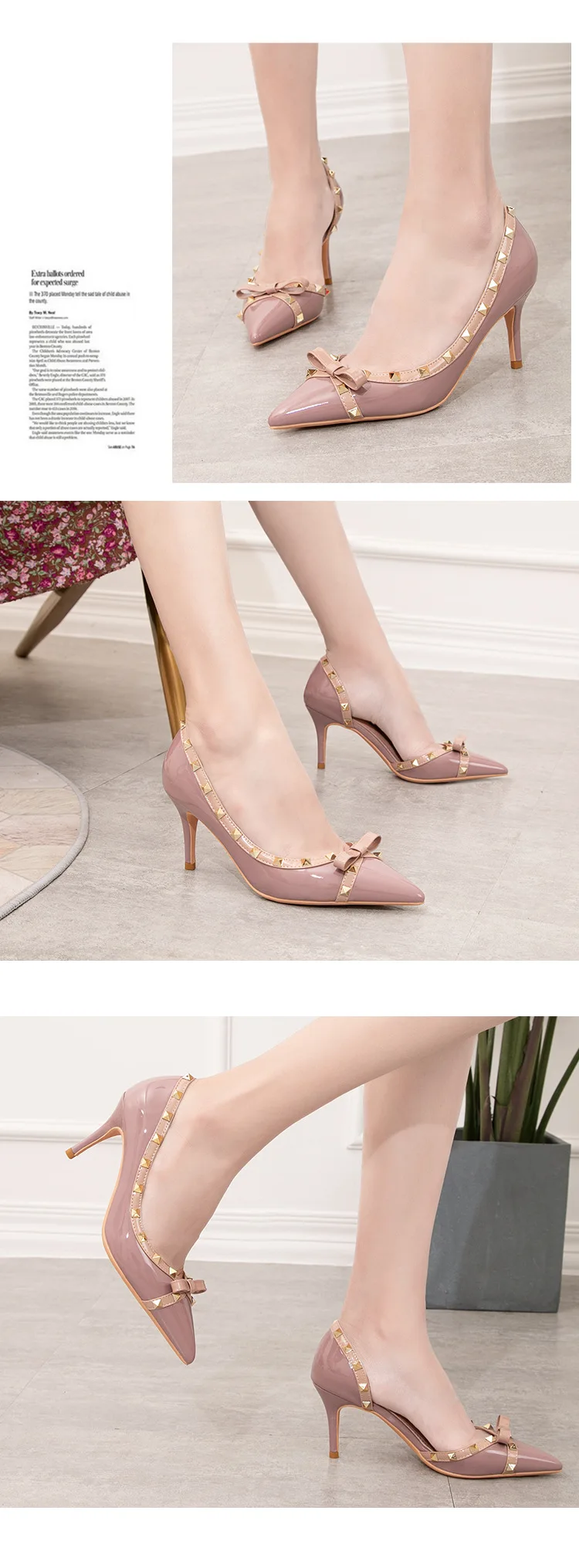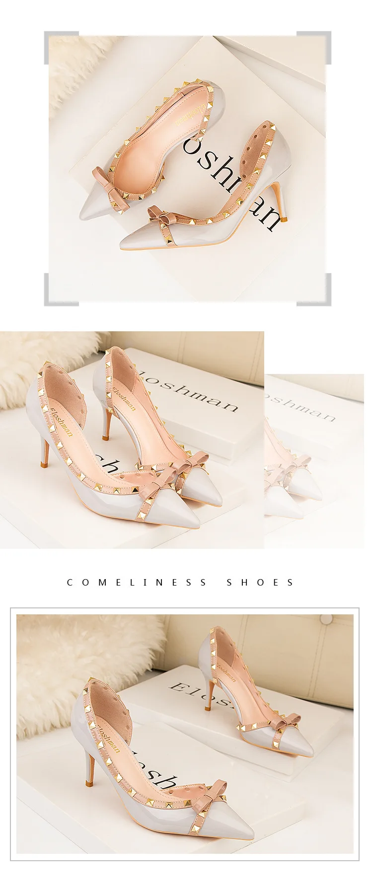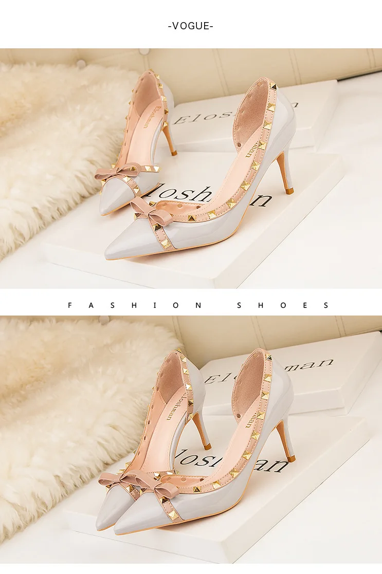 High-heeled women's shoes stiletto heel shallow mouth pointed toe hollow rivet bow elegant high heels for ladies