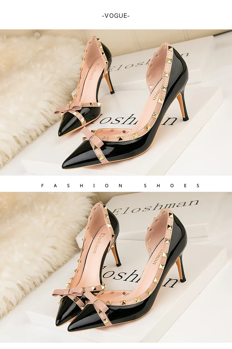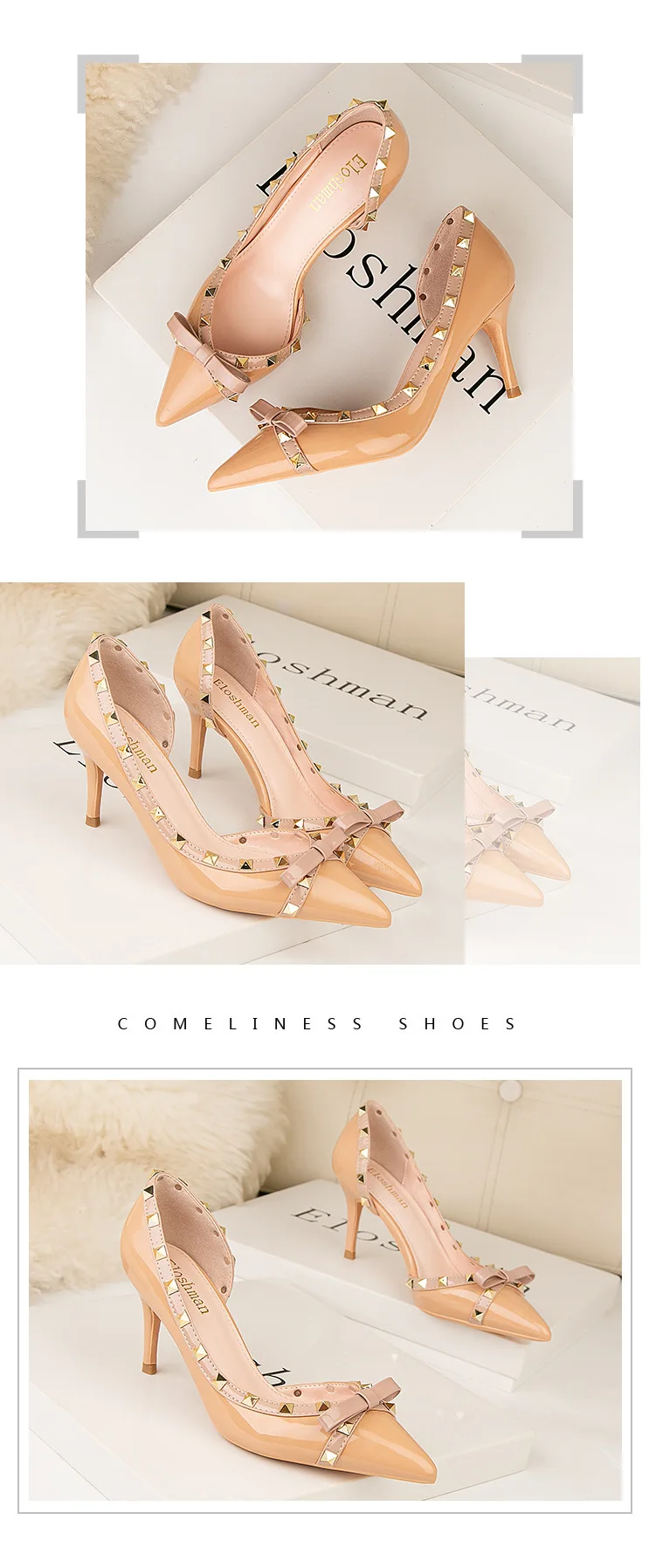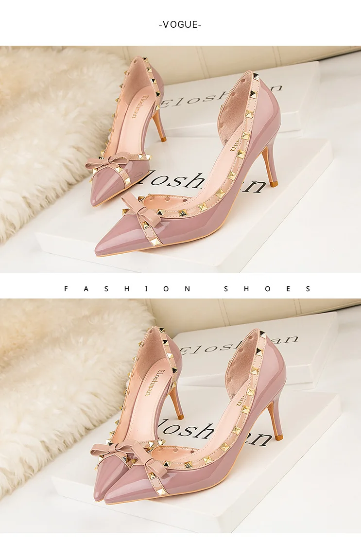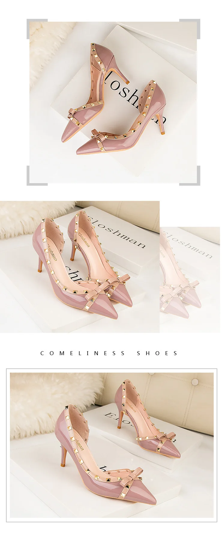 High-heeled women's shoes stiletto heel shallow mouth pointed toe hollow rivet bow elegant high heels for ladies