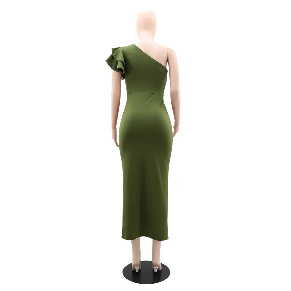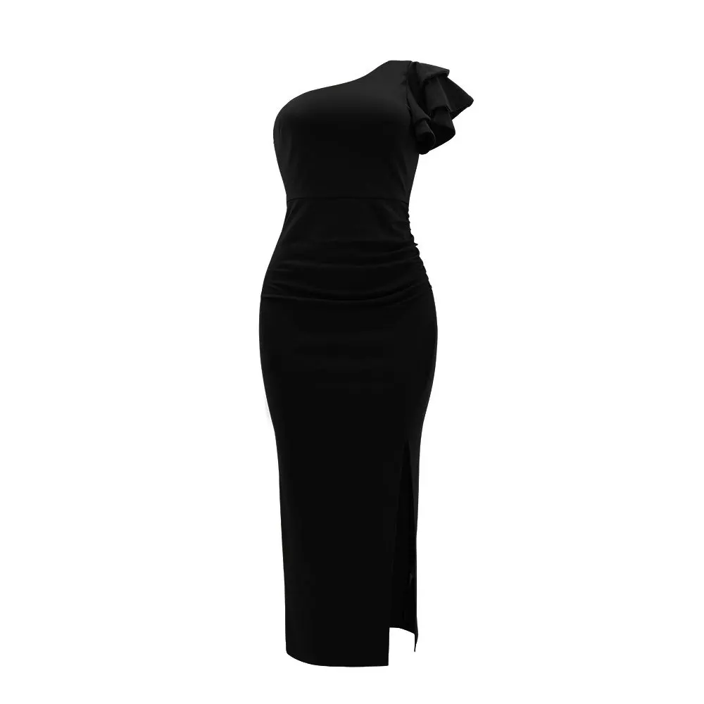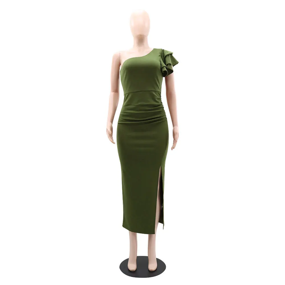High Quality Elegant Solid Color One Shoulder Pleated Slit Evening Dance Dress Sehe Fashion