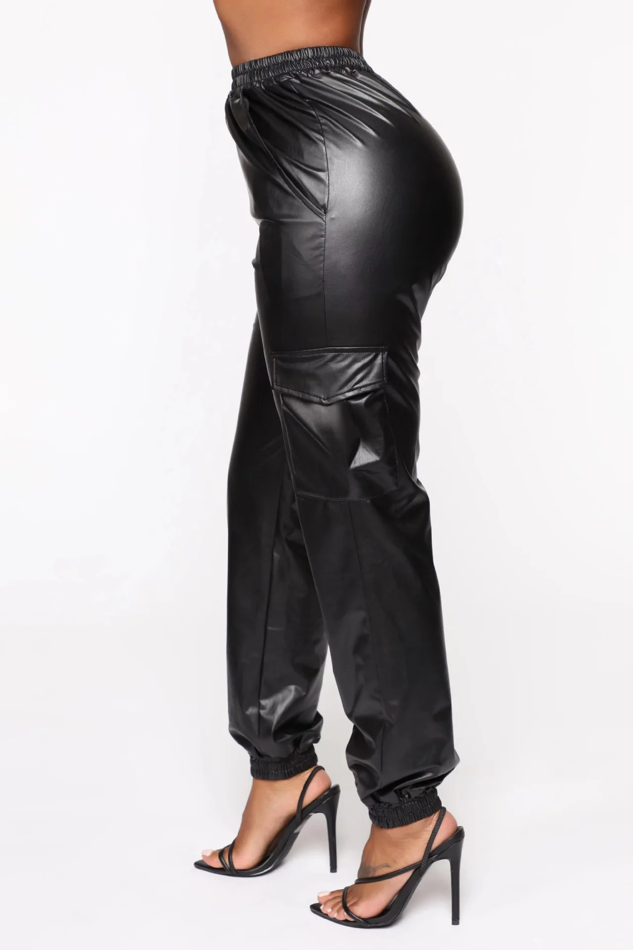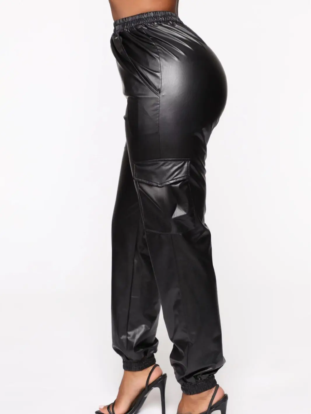 High Waist Street style women elastic waist and hem black pu leather cargo pants