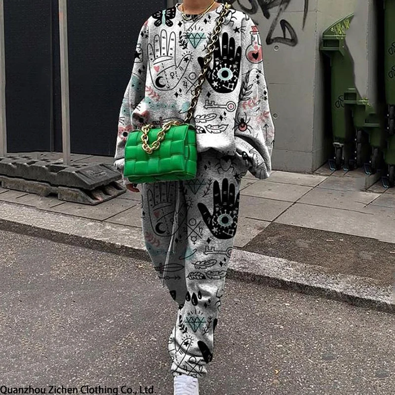 Hip Hop Graffiti Eyes Print Thin Sweatshirt Two Piece Set Women Tracksuit Streetwear Long Sleeve Pencil Pants Streetwear Fashion