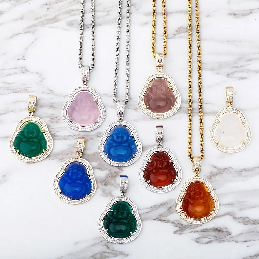 Hip Hop Iced Out Pink Green Red Agate Jade Buddha Pendant for Women Men Necklace Baguette CZ Rapper Jewelry buddha necklace
