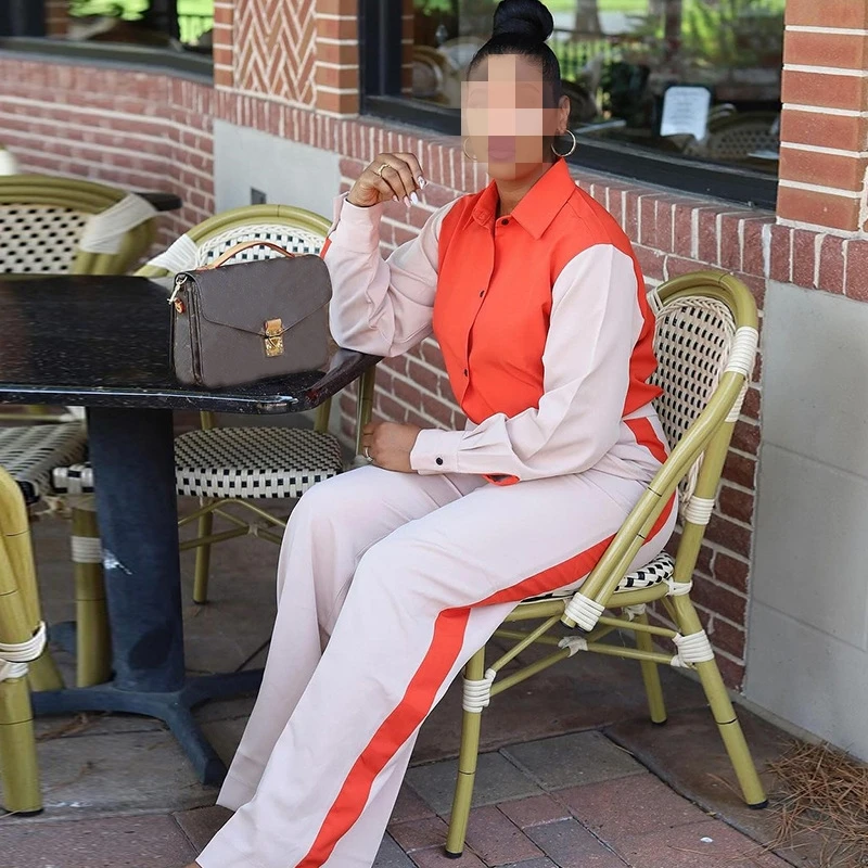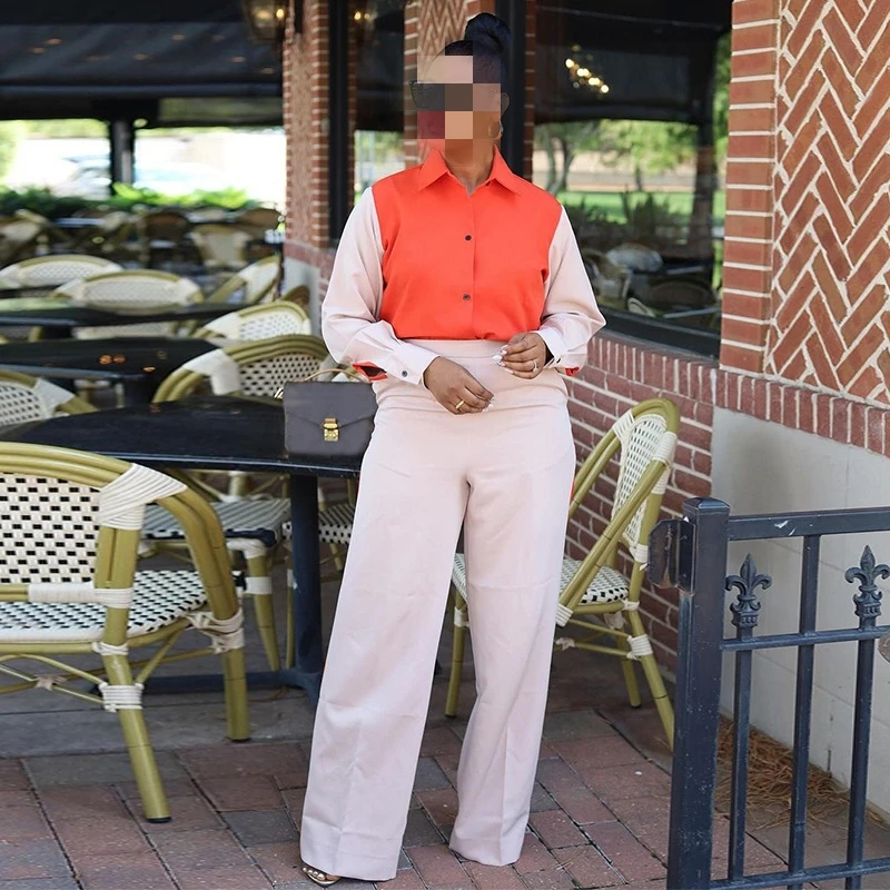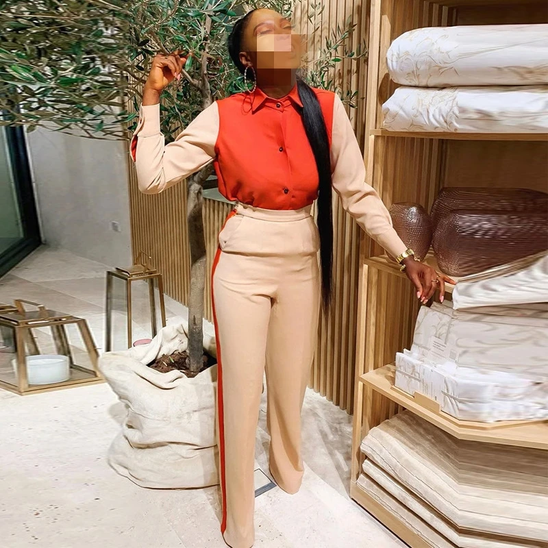 HK6999 Autumn and winter new fashion color matching lapel long-sleeved shirt high-waisted trousers casual suit