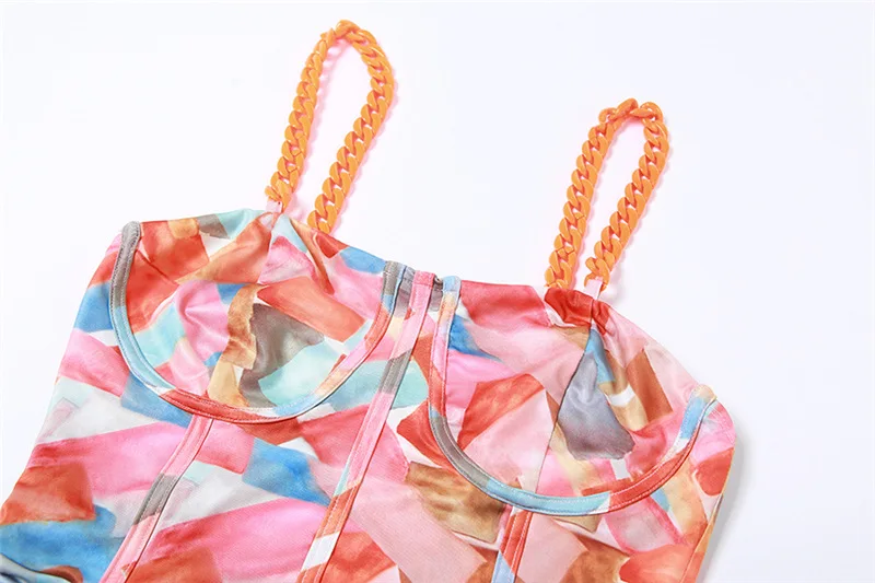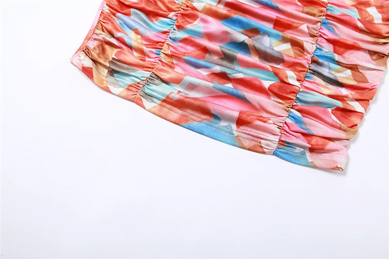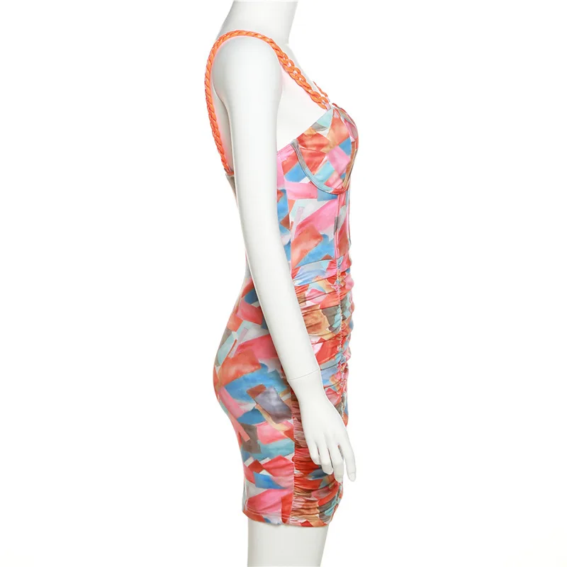 HKRED RTS Wholesale INS Lady Knitting Printing Slip Maxi Sleeveless Mini Spaghetti Ruched Sexy Party Dress