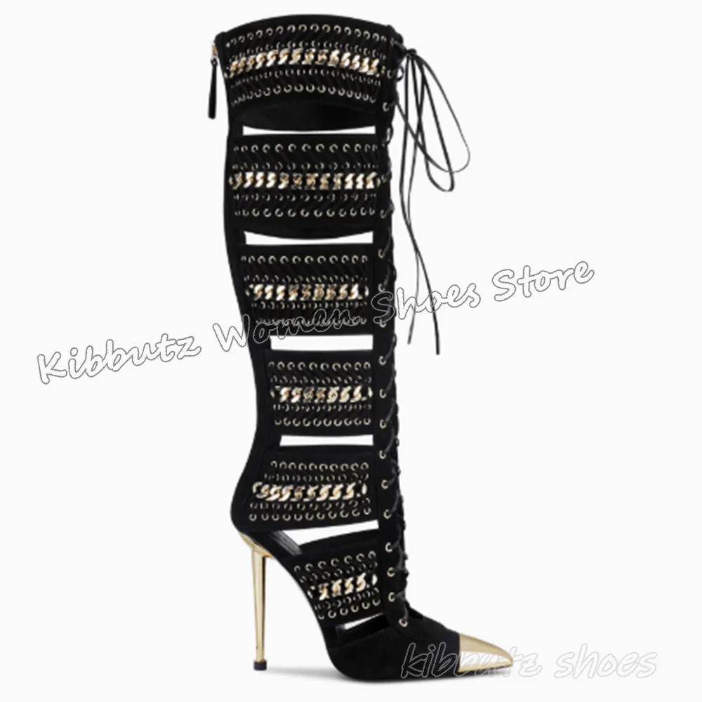 Hollow Sandal Boots Knee High Denim Cloth Patchwork Lace-Up Mixed Color Fashion Elegant Concise Sexy Women Shoes New Pointy Heel