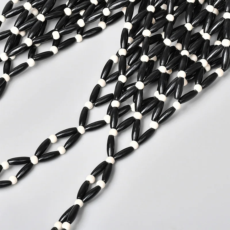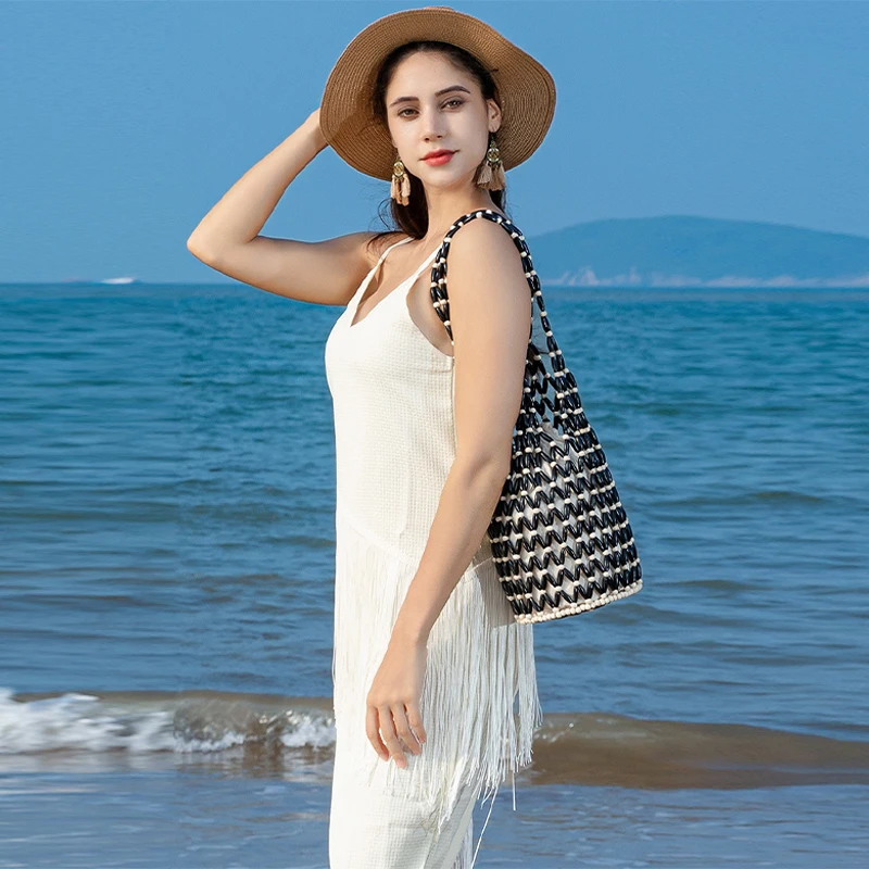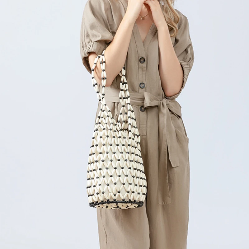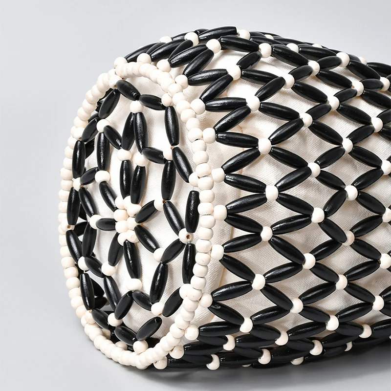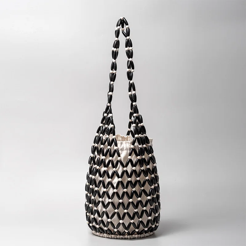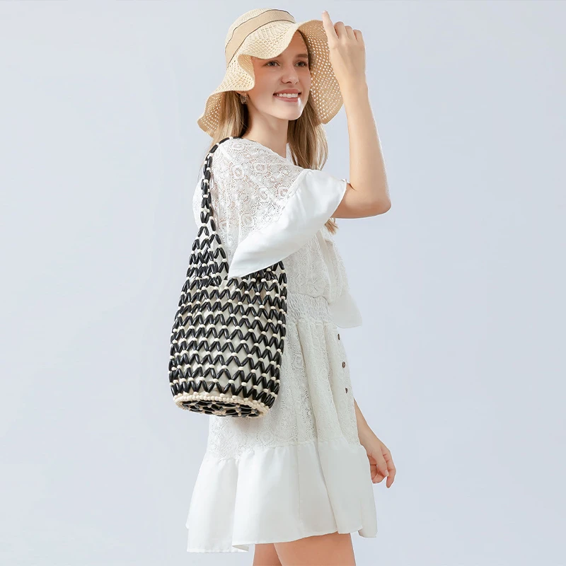Hollow wood bead straw bag lady fashion brand texture drawstring design shoulder bag simple versatile cylindrical crossbody bag