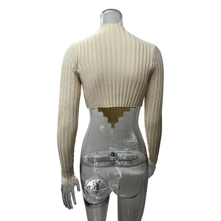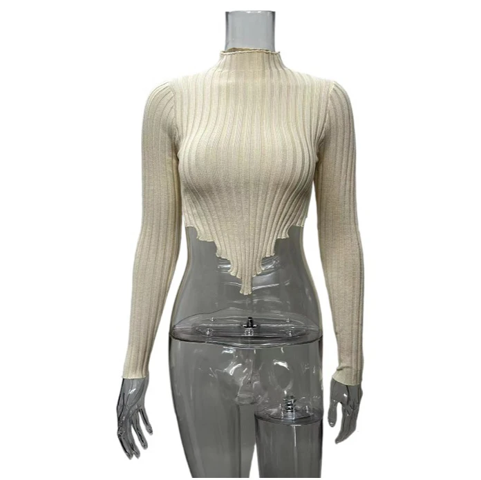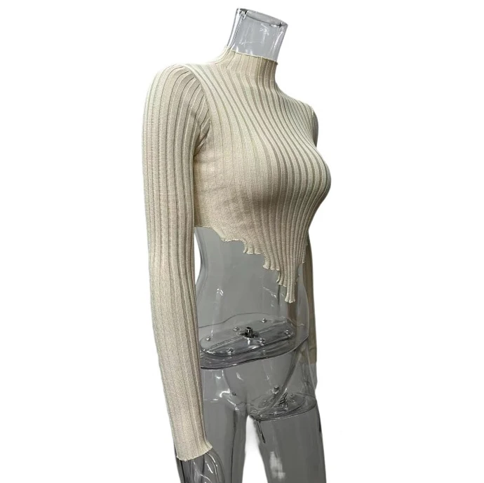 Hot sale fall spring fashion ladies sexy long sleeve crop top irregular high neck rib knit wear women sweaters