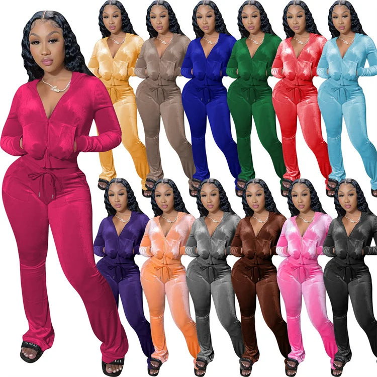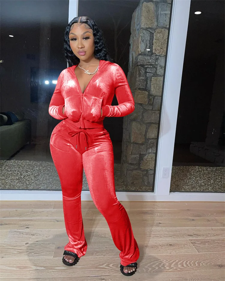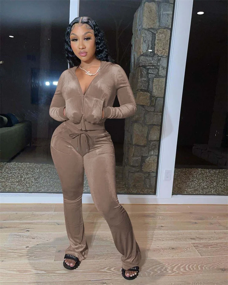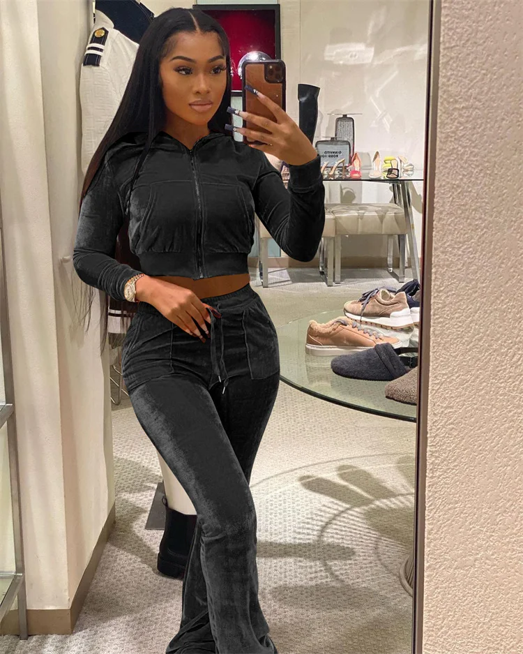 Hot Sale Fall Women's hoodie Set Zipper Pocket Crop Top Jacket Velvet Jogging suit Velour tracksuits Women Two Piece set