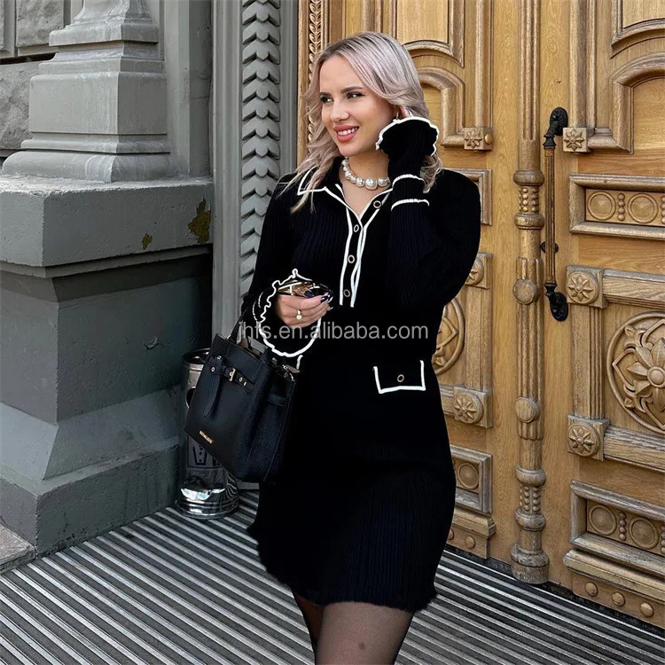 J&H Ruffle Edge Knitted Dress 2024 New European and American Autumn/Winter Woolen Dress Flip Collar Tight Mid length